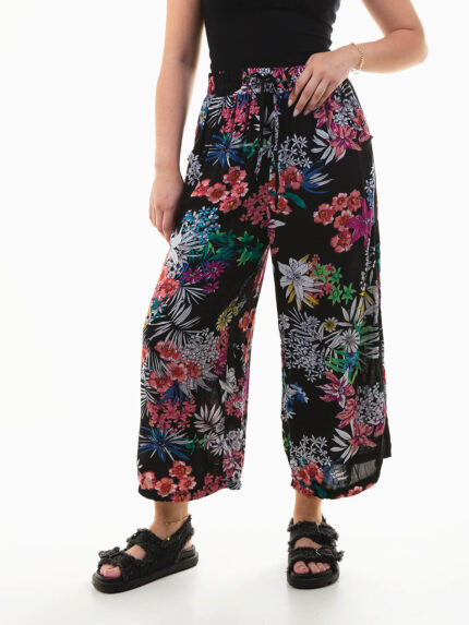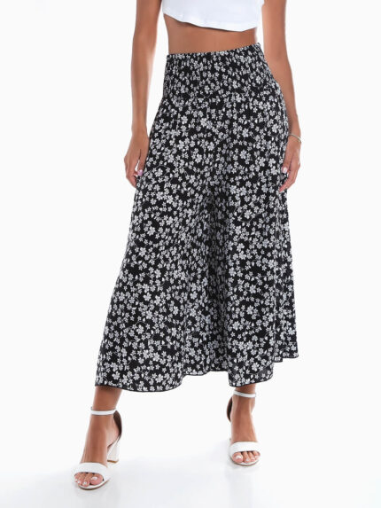 Calças largas floridas cintura elástica