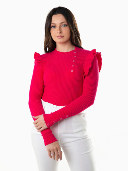 Camisola malha canelada folhos aplicados