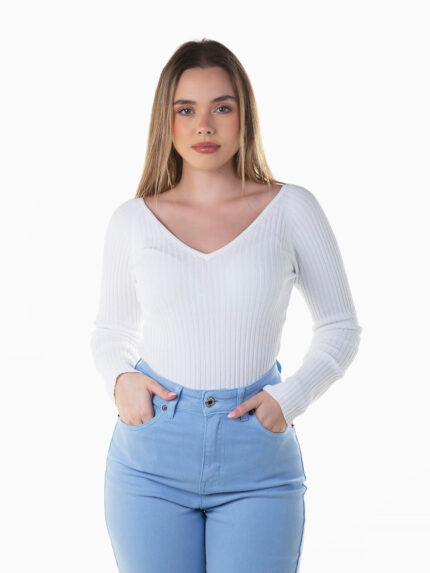 Camisola canelada decote V à frente e atrás