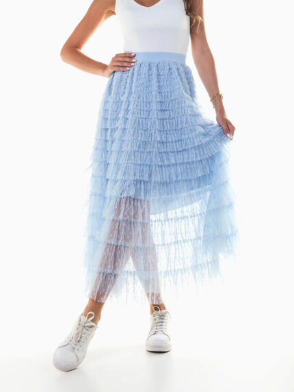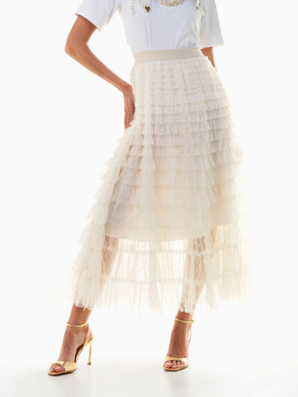 Saia tule midi com folhos