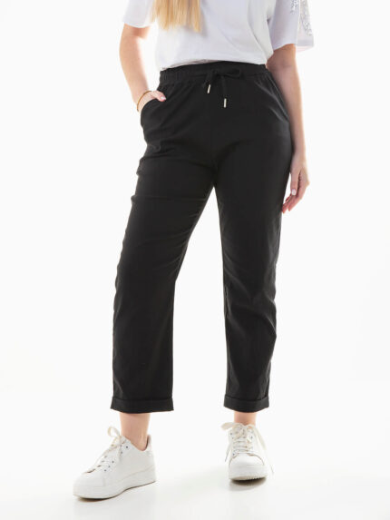 Calças elásticas com dobra