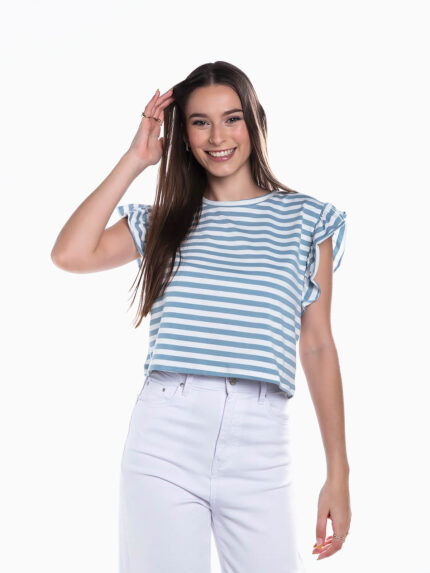 T-shirt curta às riscas com folhos