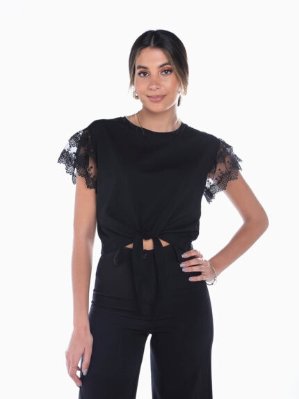 T-shirt de tule punhos em renda