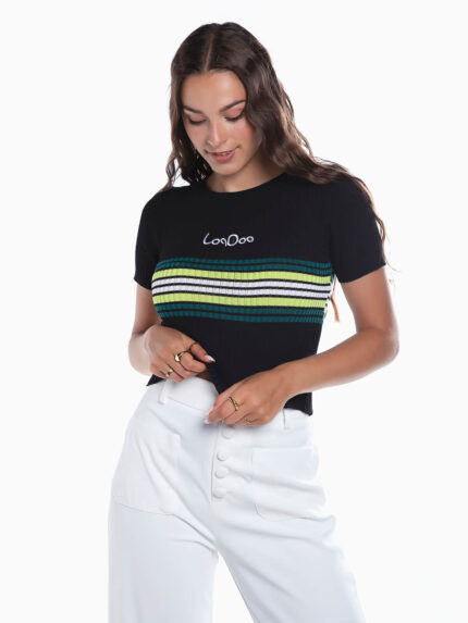 T-shirt curta malha canelada riscas