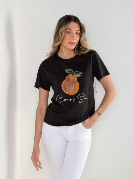 T-shirt manga curta estampada com brilhos