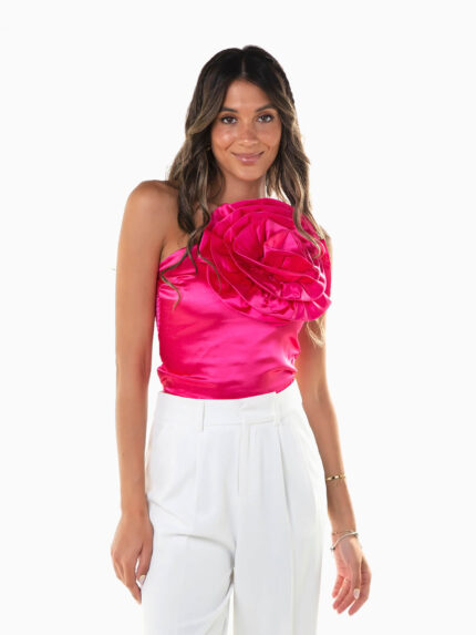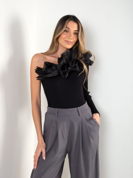 Top assimétrico com flor