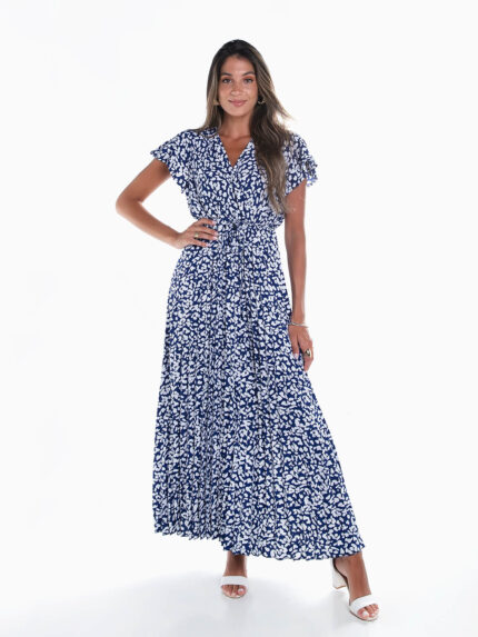Vestido comprido plissado animal print