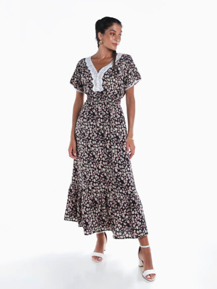 Vestido comprido floral encaixe folho