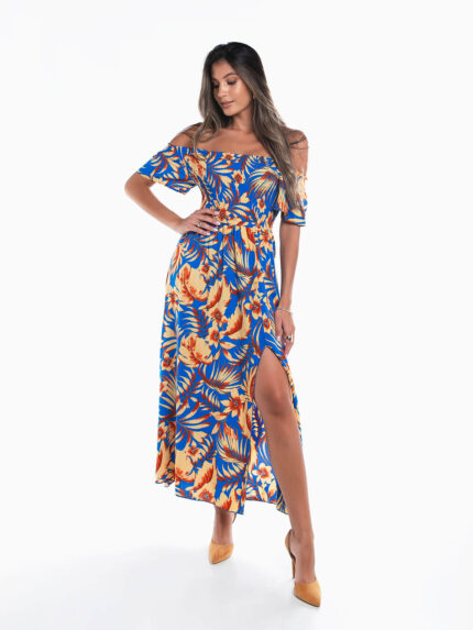 Vestido comprido floral com abertura