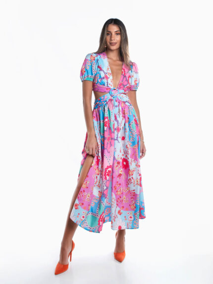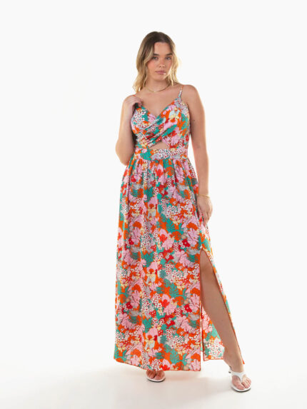 Vestido comprido floral com recortes