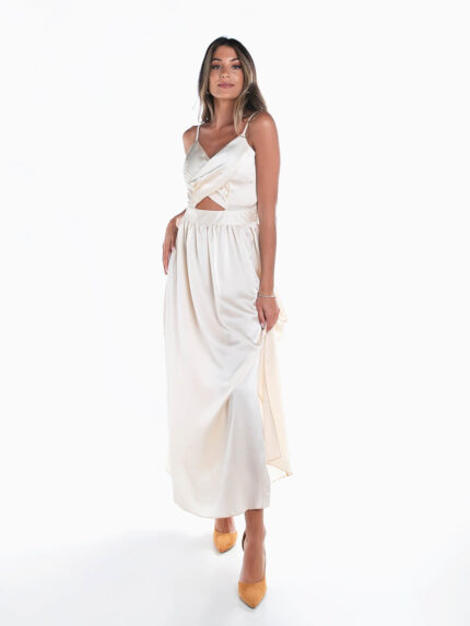 Vestido comprido acetinado em V