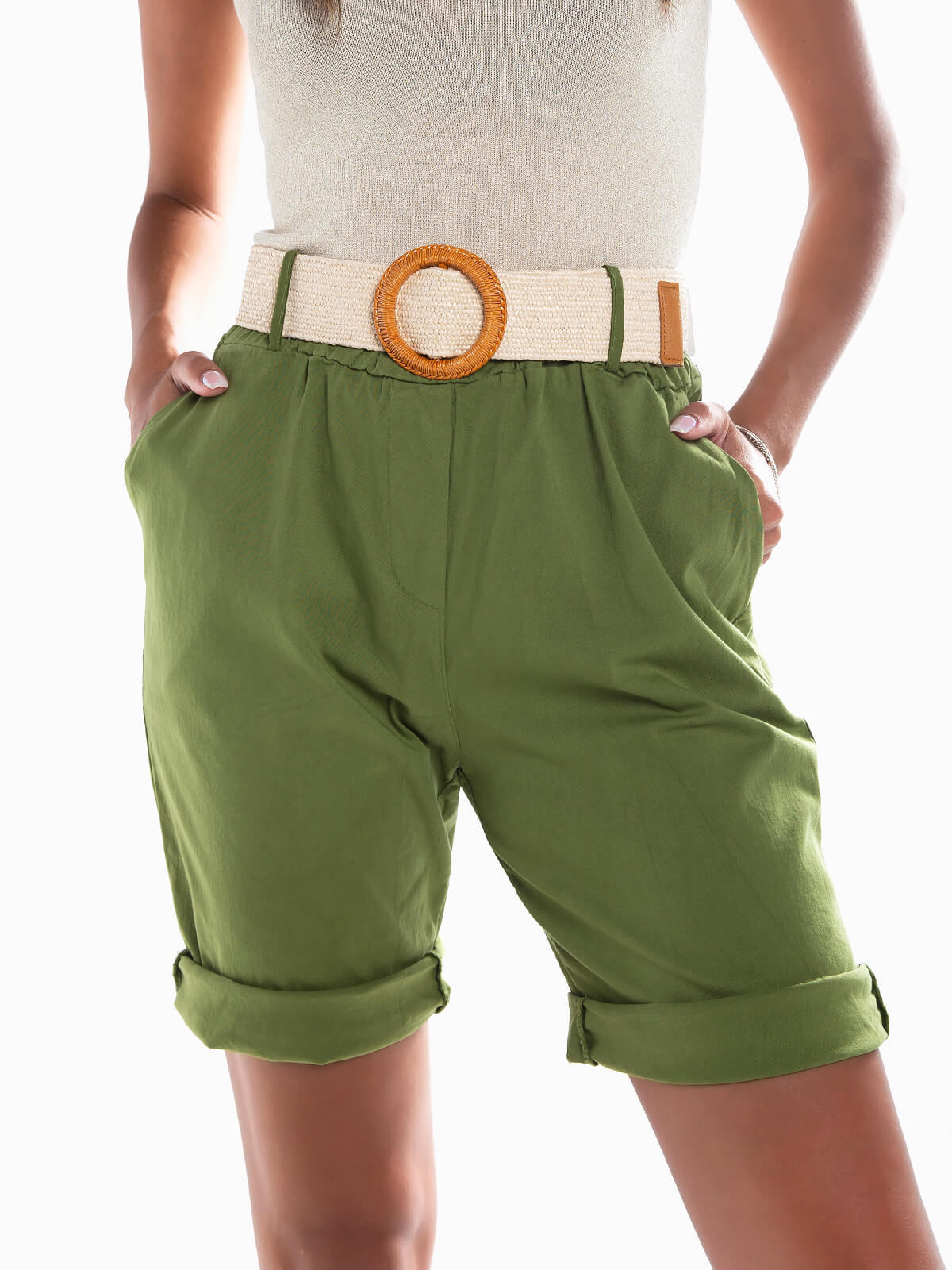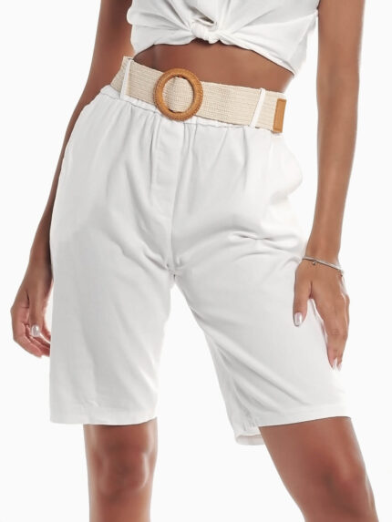 Bermudas em tecido de algodão com cinto efeito ráfia removível. Calções compridos de cintura alta elástica com 2 bolsos.