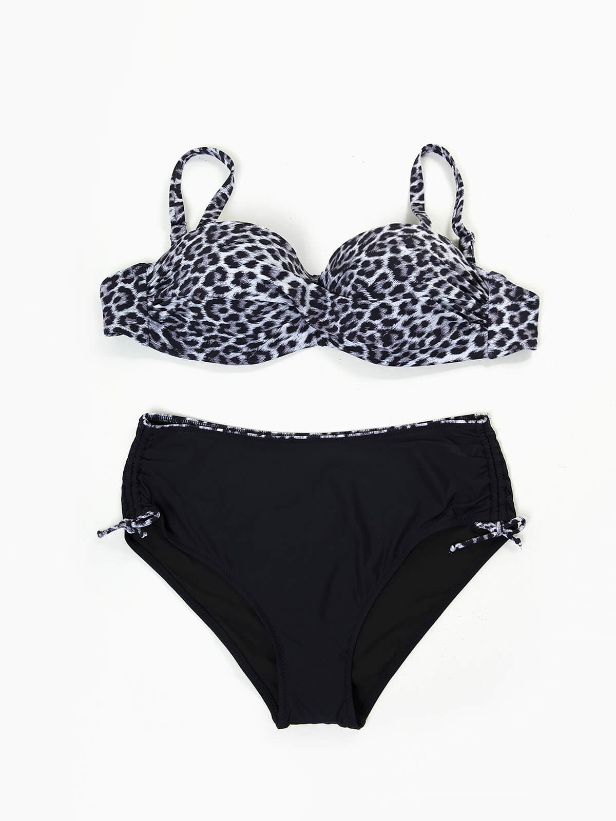 Top bandeau com almofada efeito push-up para oferecer melhor suporte. Alças amovíveis e aperto posterior de laço. Cueca de cintura alta com cobertura parcial e cordão elástico lateral para ajustar.