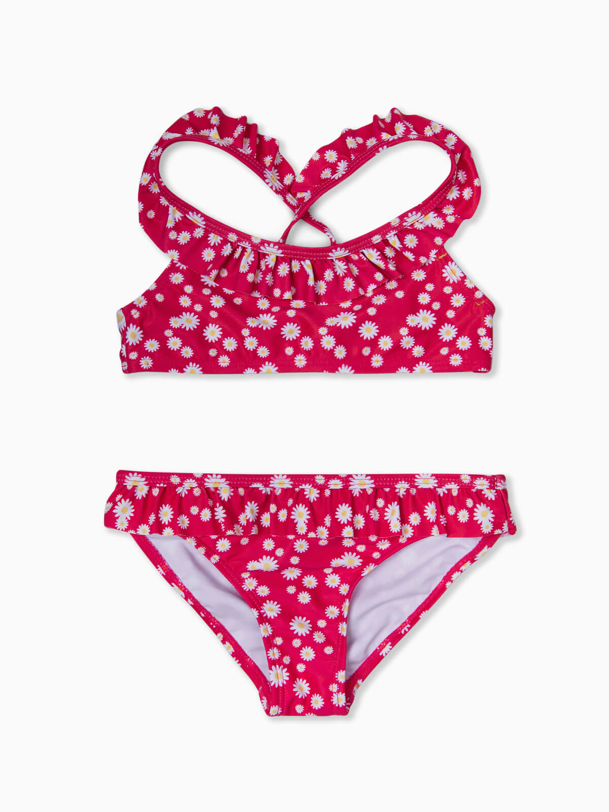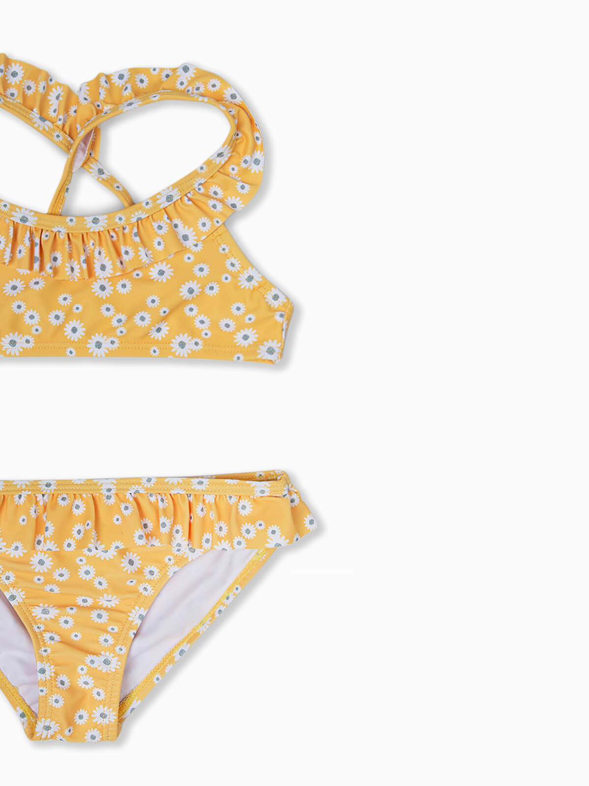 Biquíni com estampado de flores para menina. Top com decote redondo e folho aplicado. Alças finas cruzadas atrás. Cueca de cintura elástica com folho.