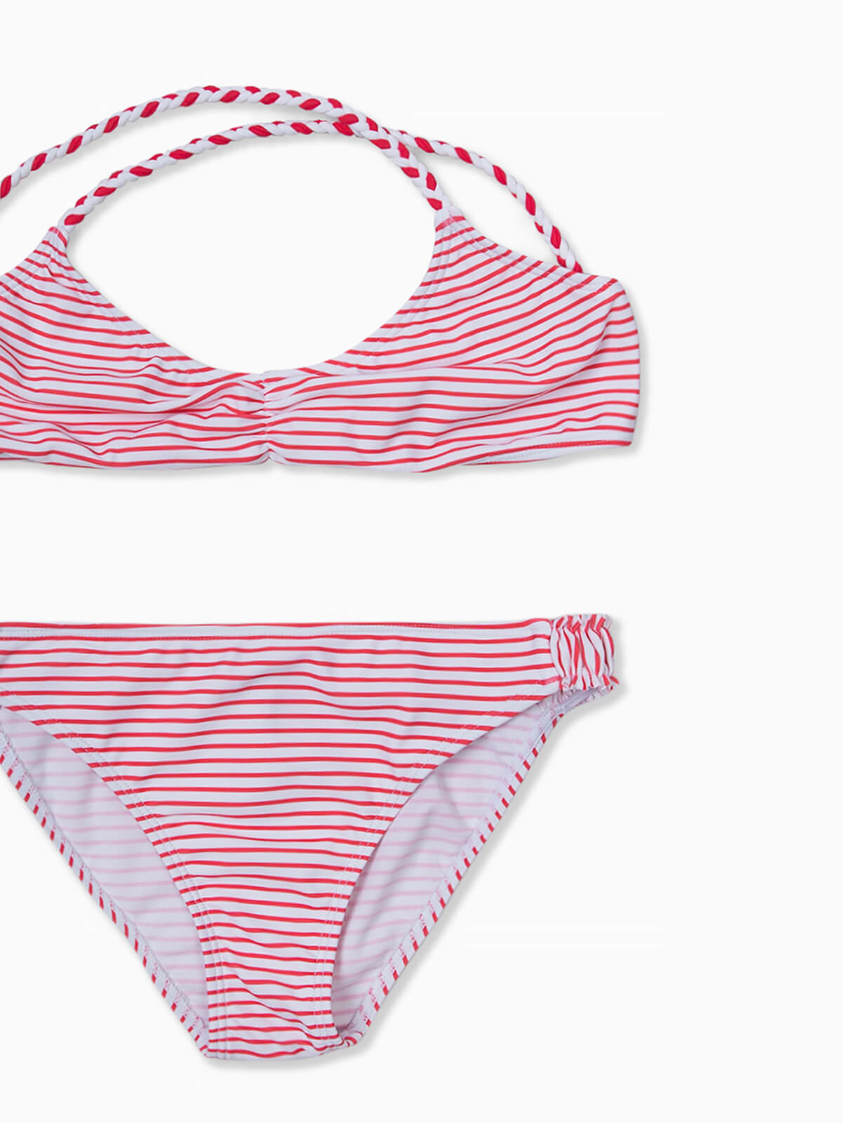Top biquíni às riscas com alças entrançadas cruzadas atrás. Decote em V e aperto posterior. Cueca de biquíni com cintura elástica e pormenores franzidos.