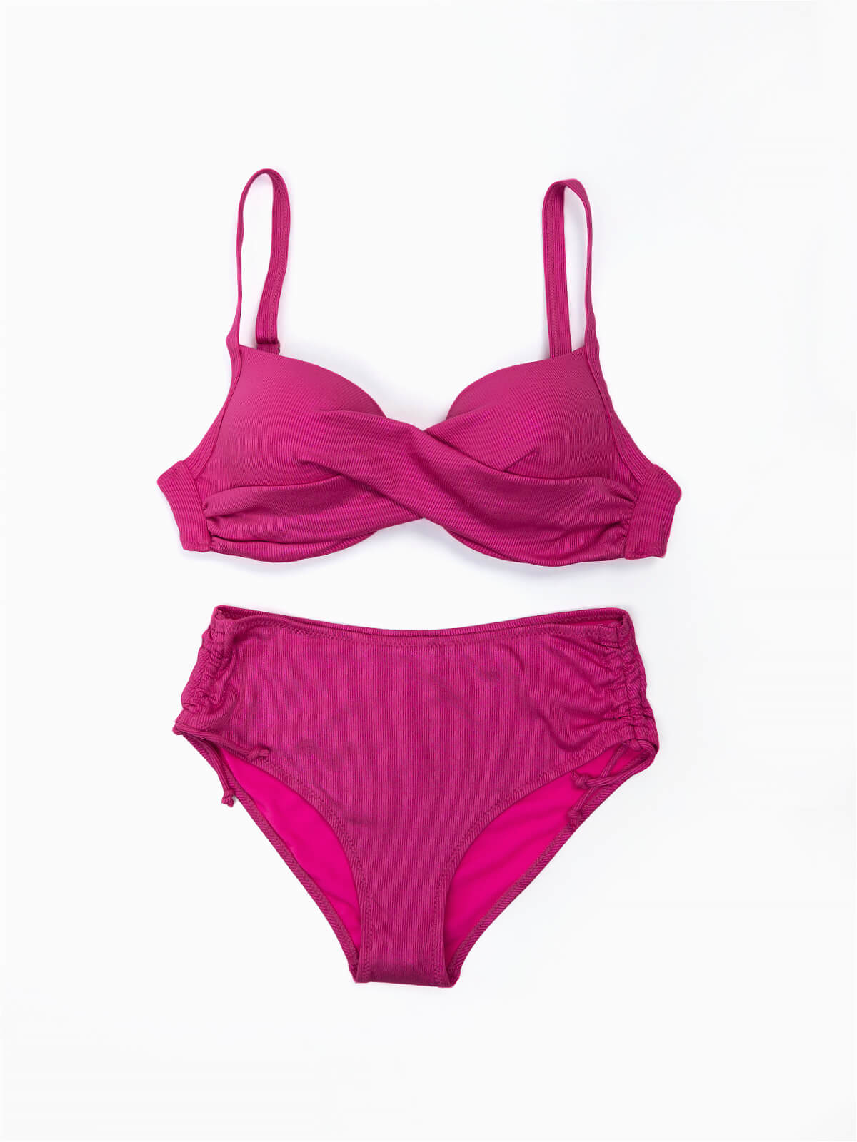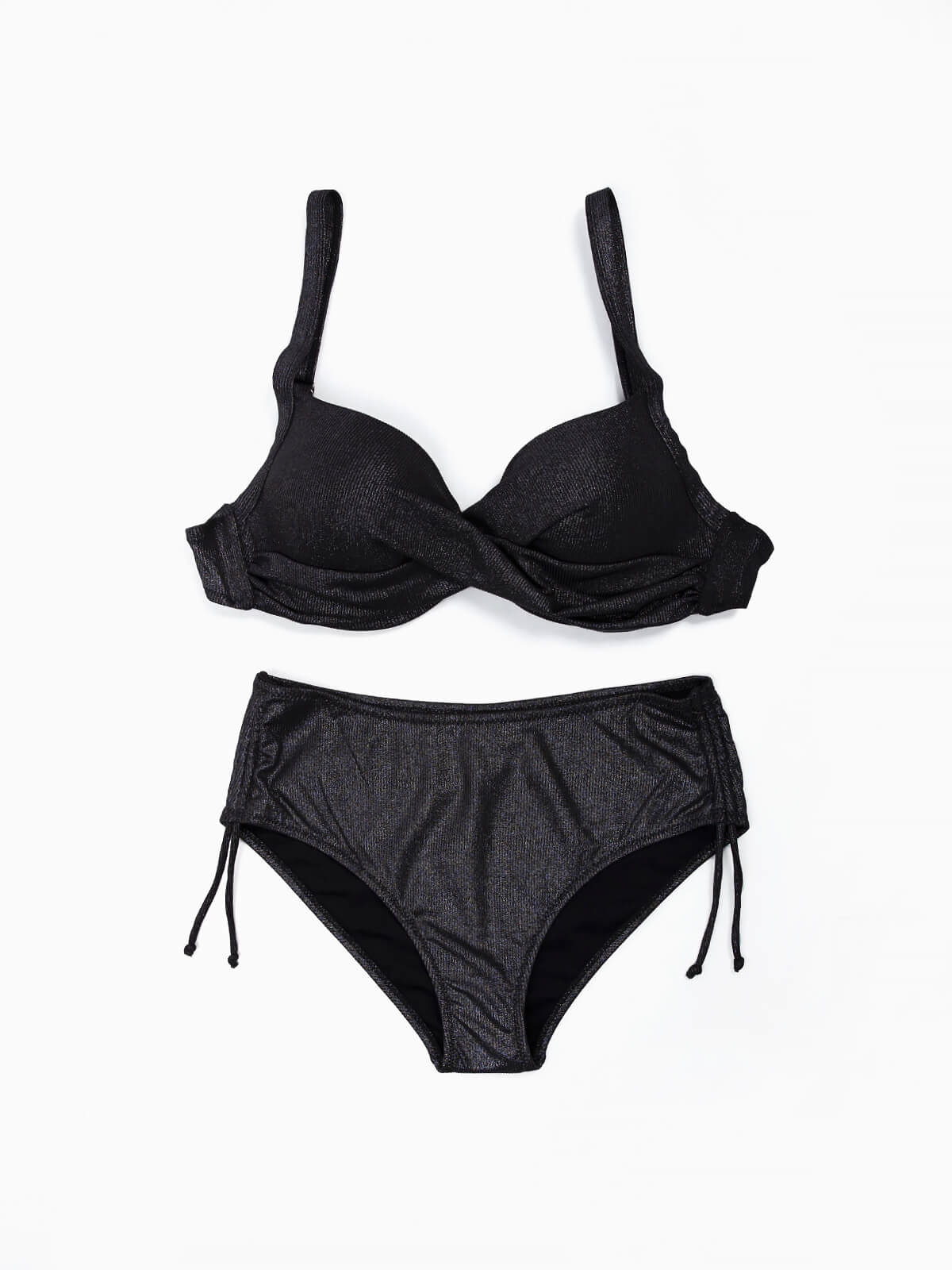 Top de biquíni almofadado com pormenor cruzado à frente. Alças reguláveis e aperto de laço. Copas com aro para melhor suporte. Cueca cintura alta com cobertura parcial e cordões laterais. Tecido canelado brilhante. Tamanhos Grandes.
