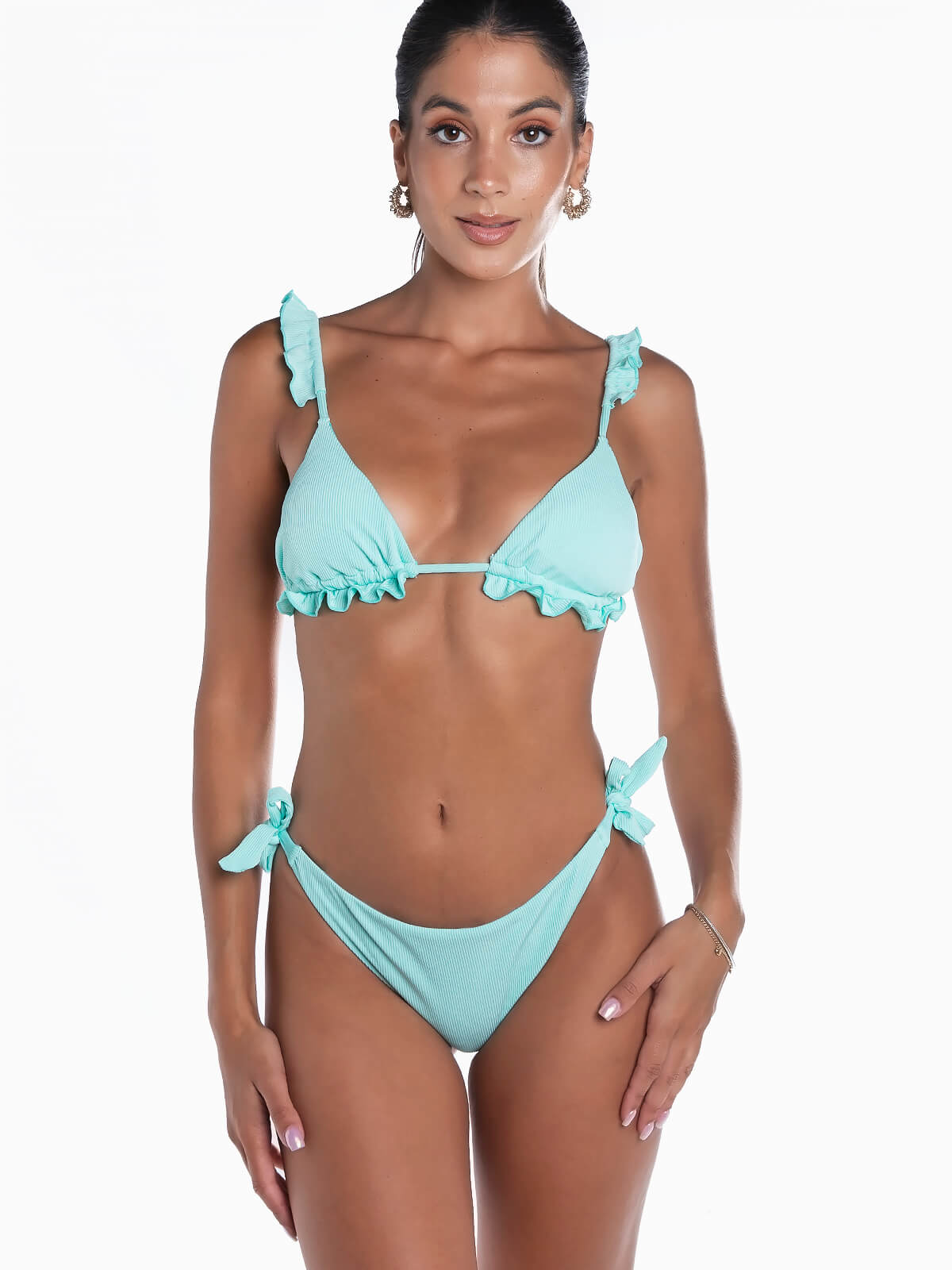 Top de biquíni triangular almofadado com alças reguláveis amovíveis. Cueca com cobertura parcial e aperto lateral de laço. Tecido canelado. Pormenor de folhos.