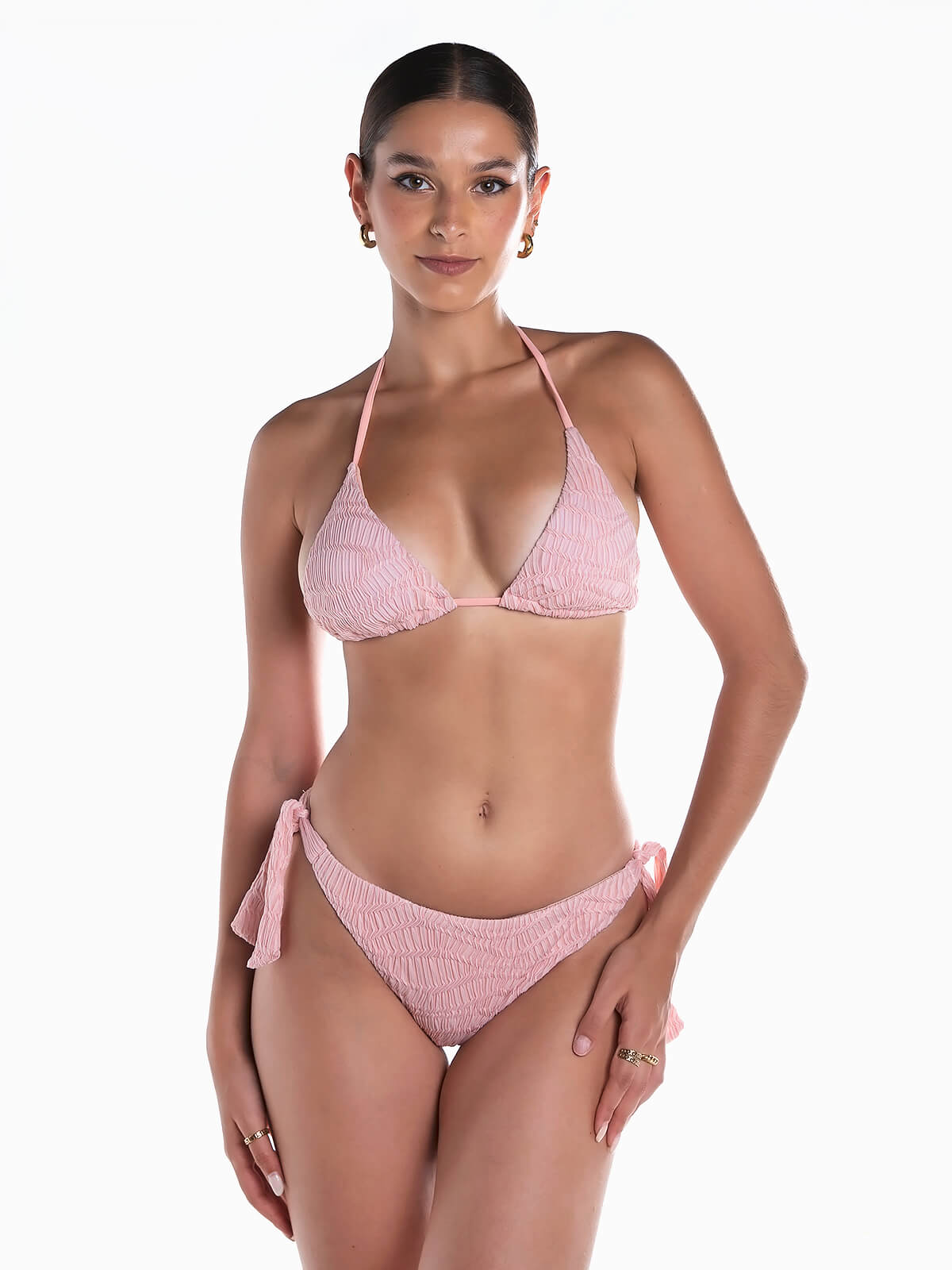 Top de biquíni triangular com almofada removível para oferecer melhor suporte. Cueca de biquíni com cobertura parcial e aperto lateral de laço. Interior forrado. Tecido com relevo.