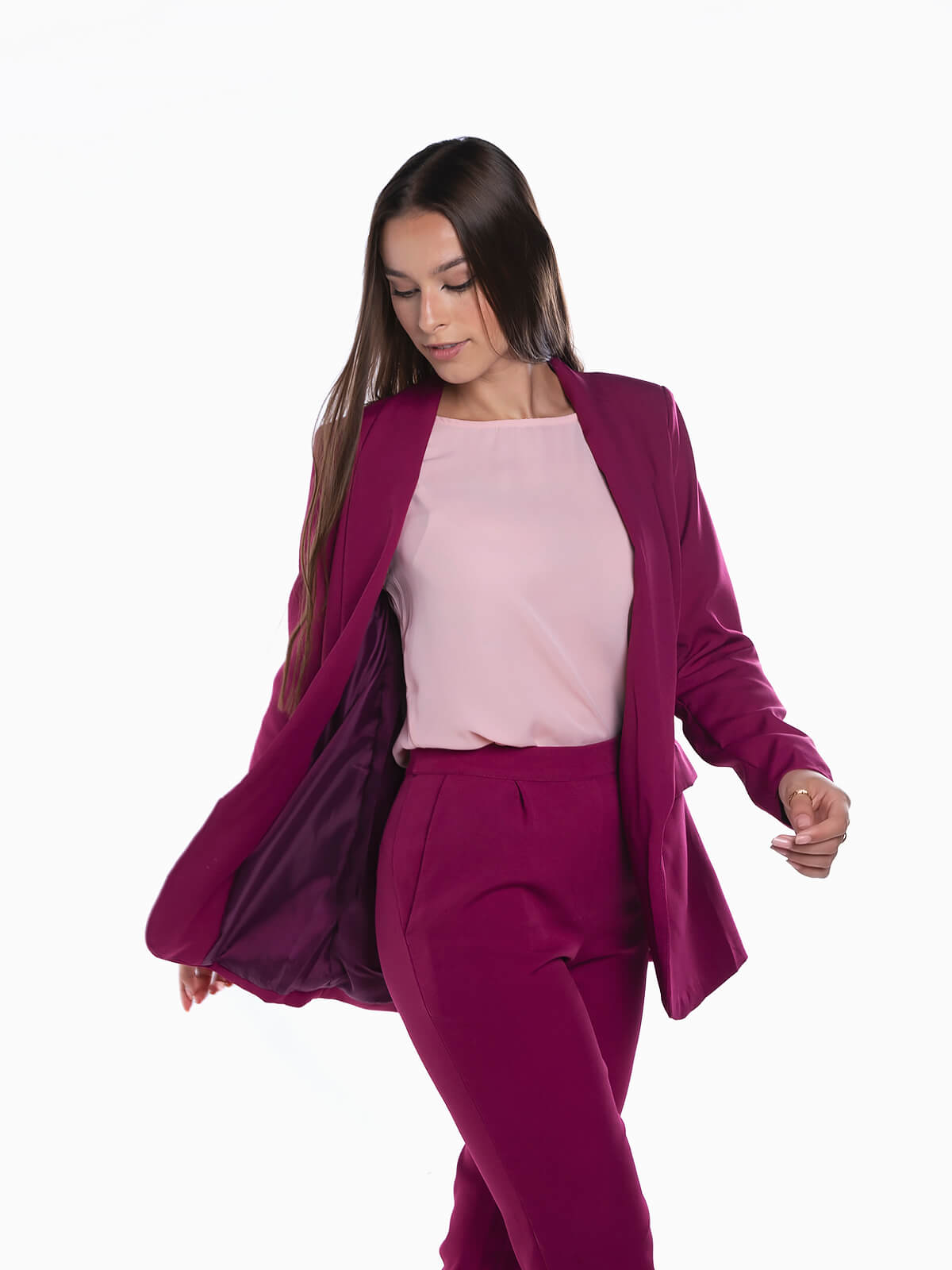 Blazer aberto com bolsos para senhora. Blazer forrado com gola de abas e manga comprida.