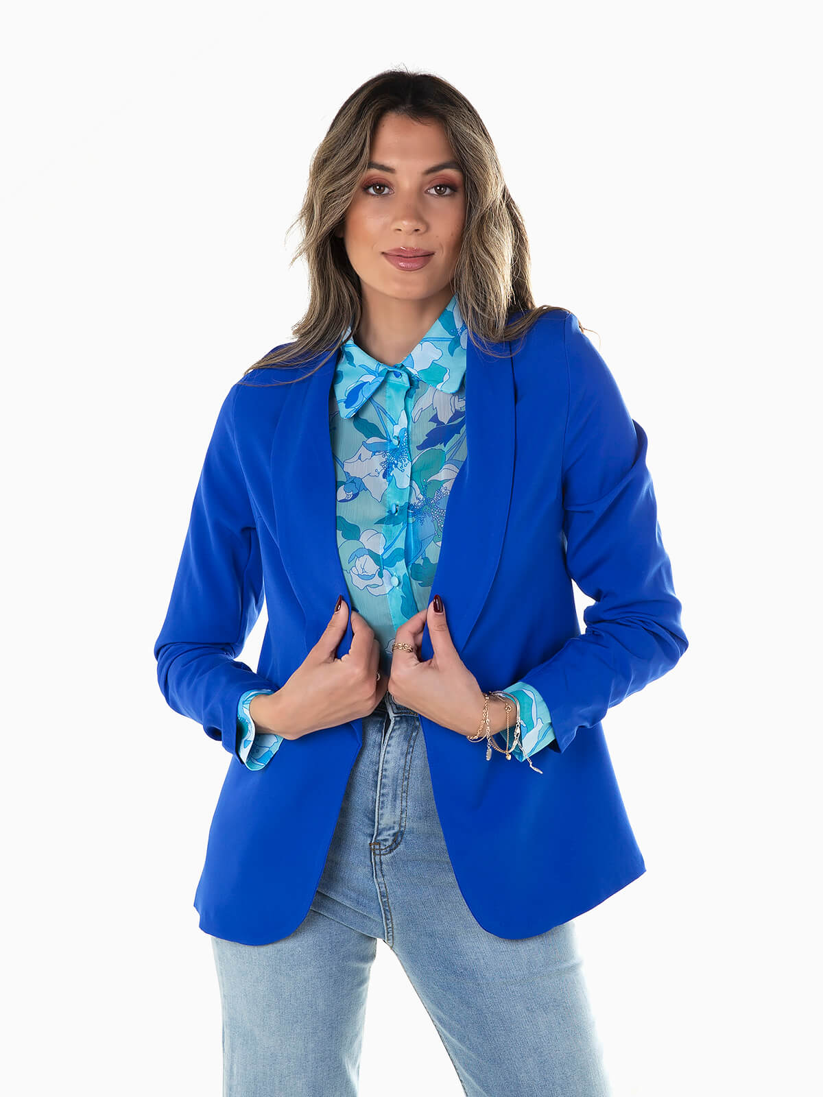 Blazer aberto com mangas franzidas e ombreiras. Blazer para senhora com interior forrado e palas decorativas. Gola com lapelas.