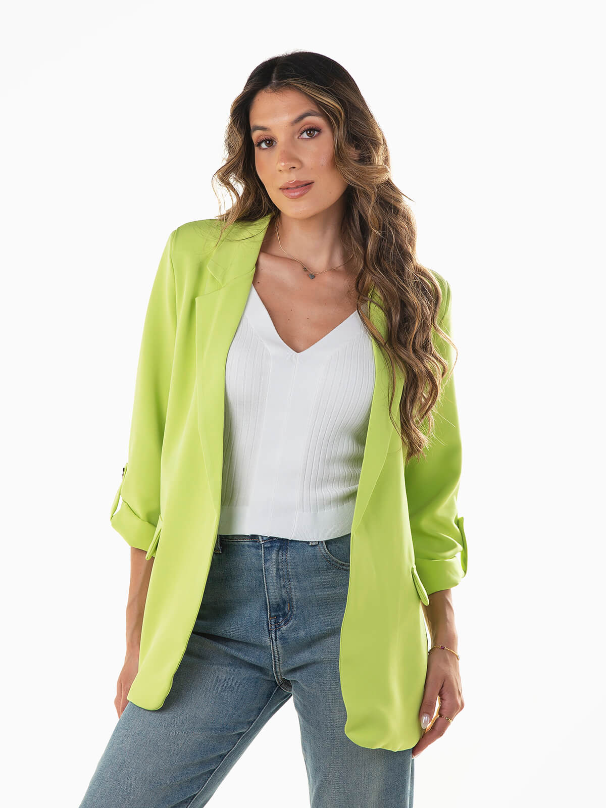 Blazer aberto verde alface de manga comprida com presilhas para ajustar. Blazer para senhora com interior forrado e gola abas. Palas decorativas e ombreiras.