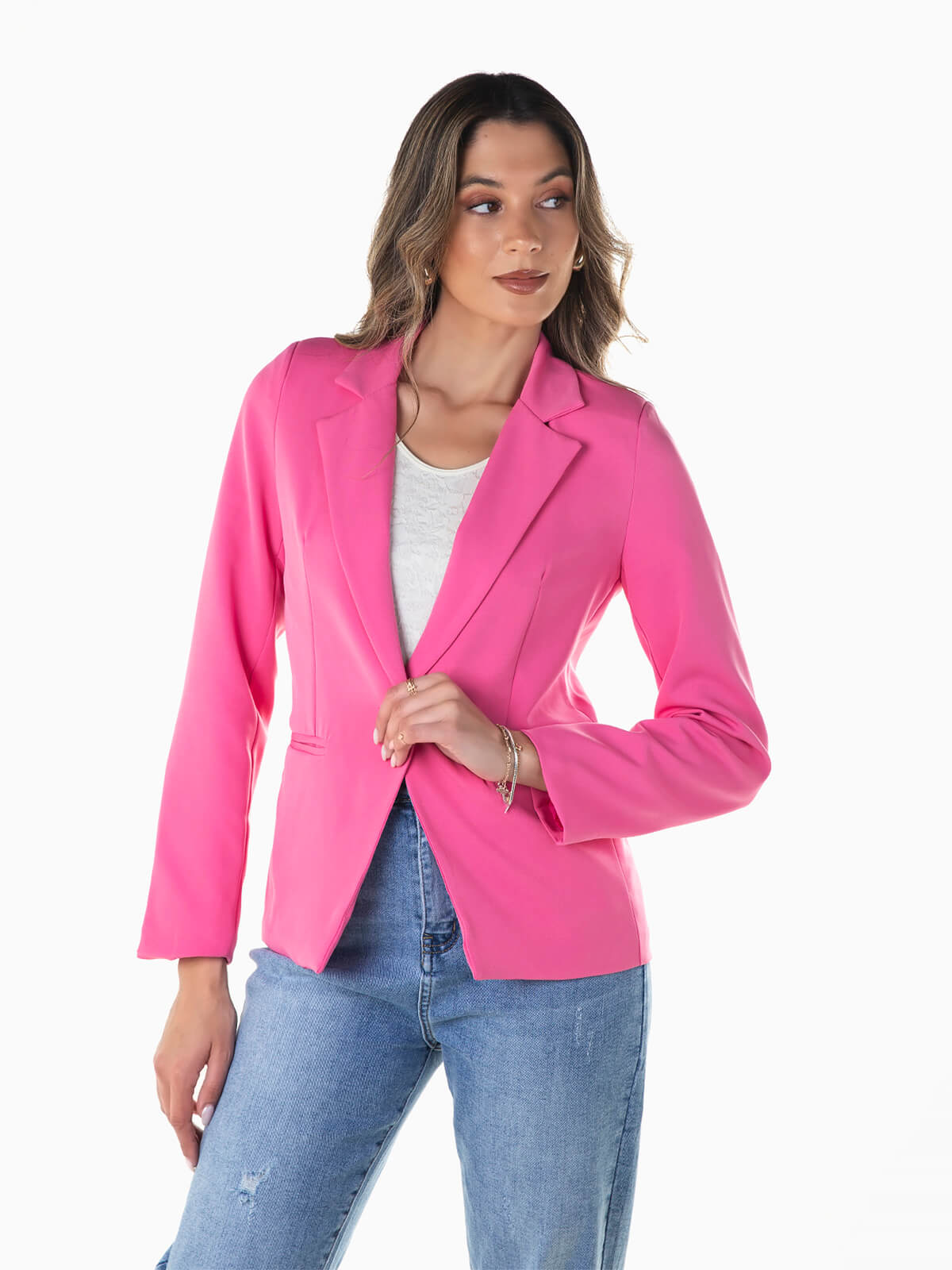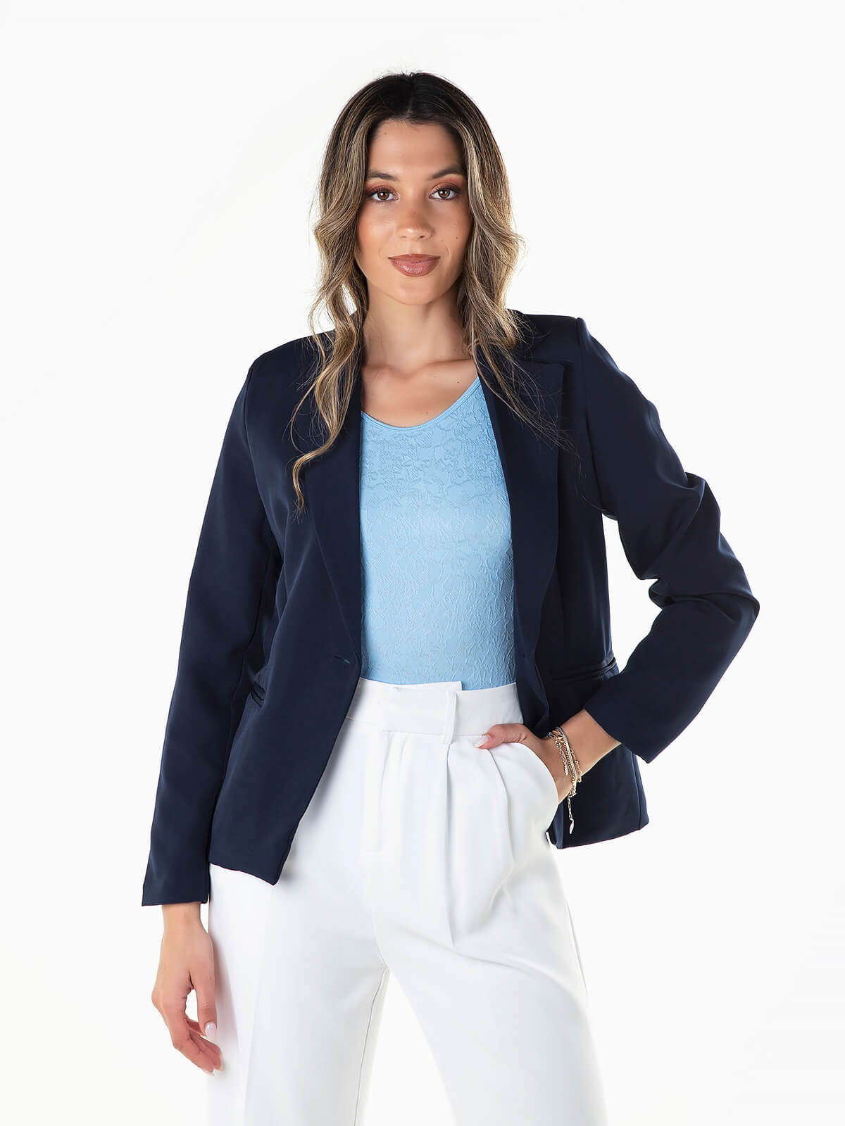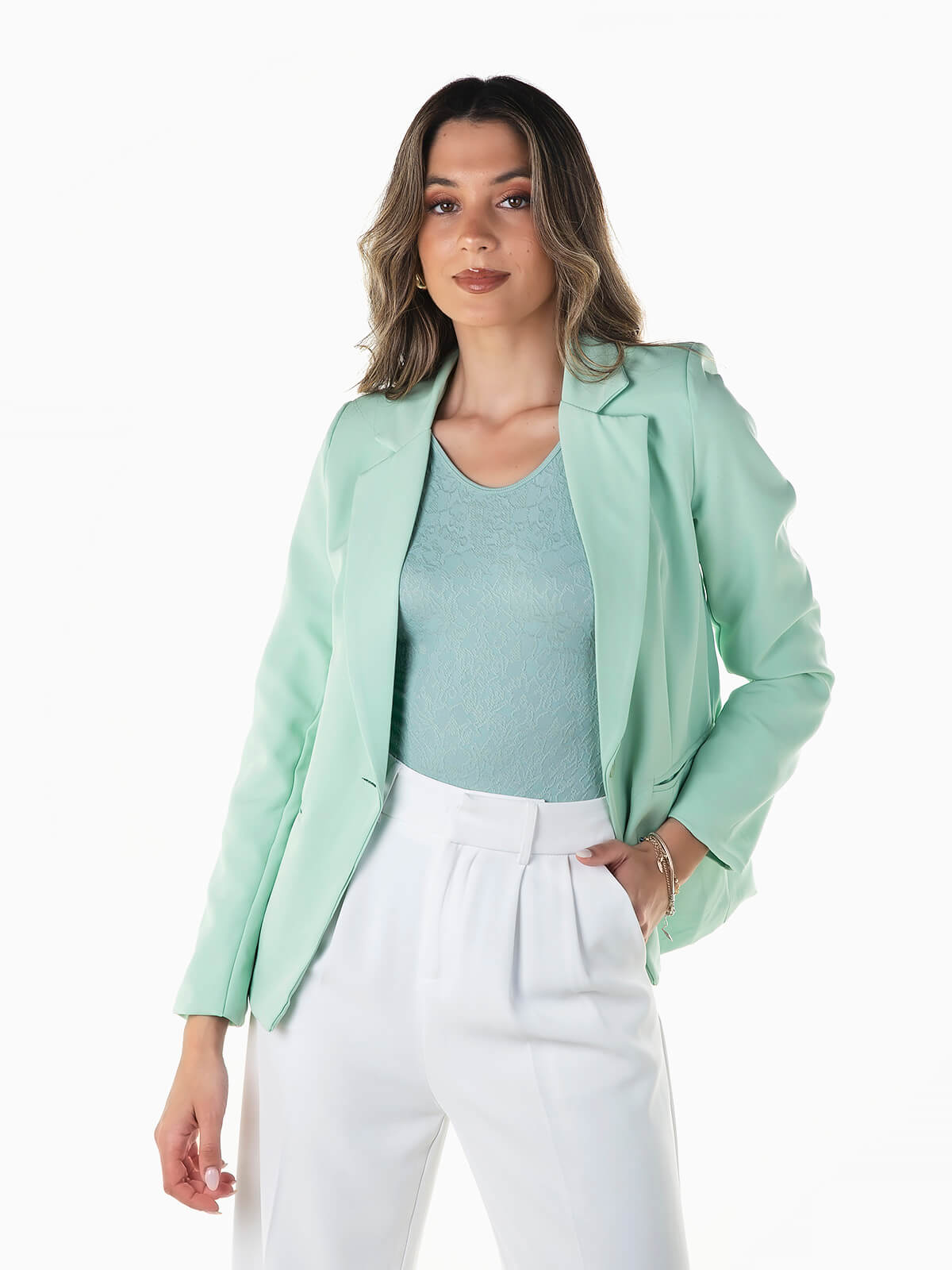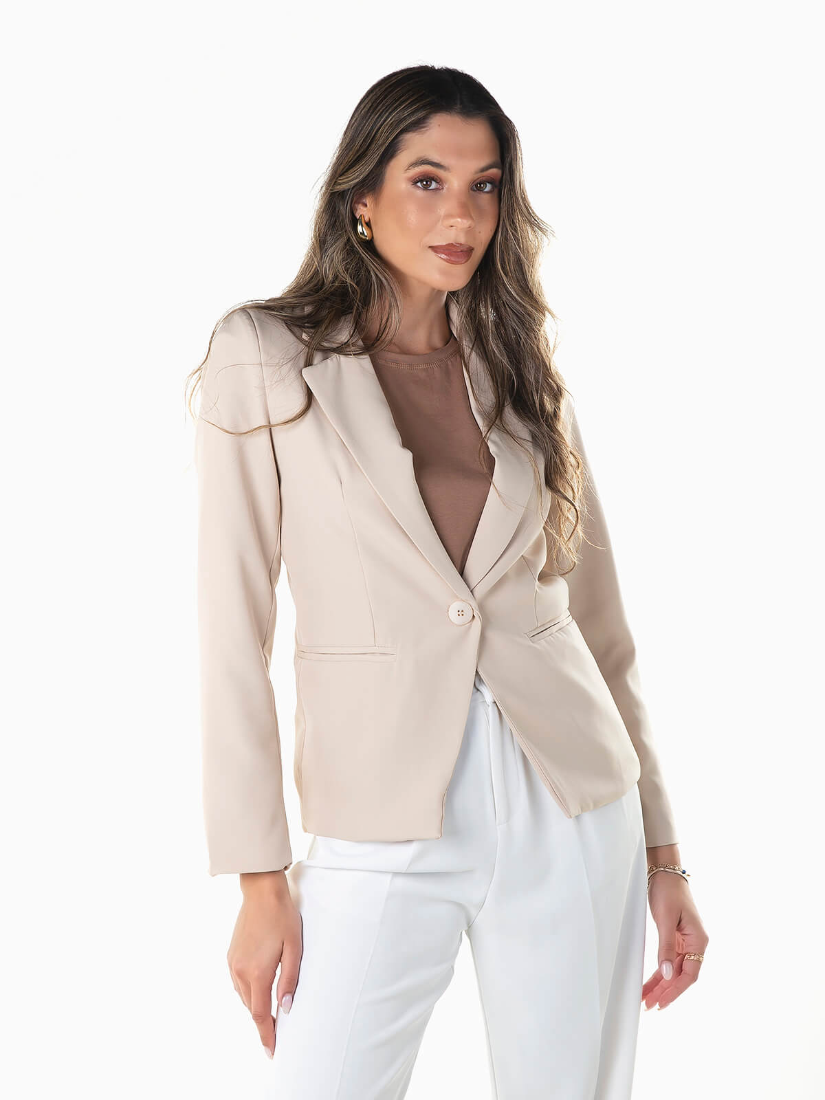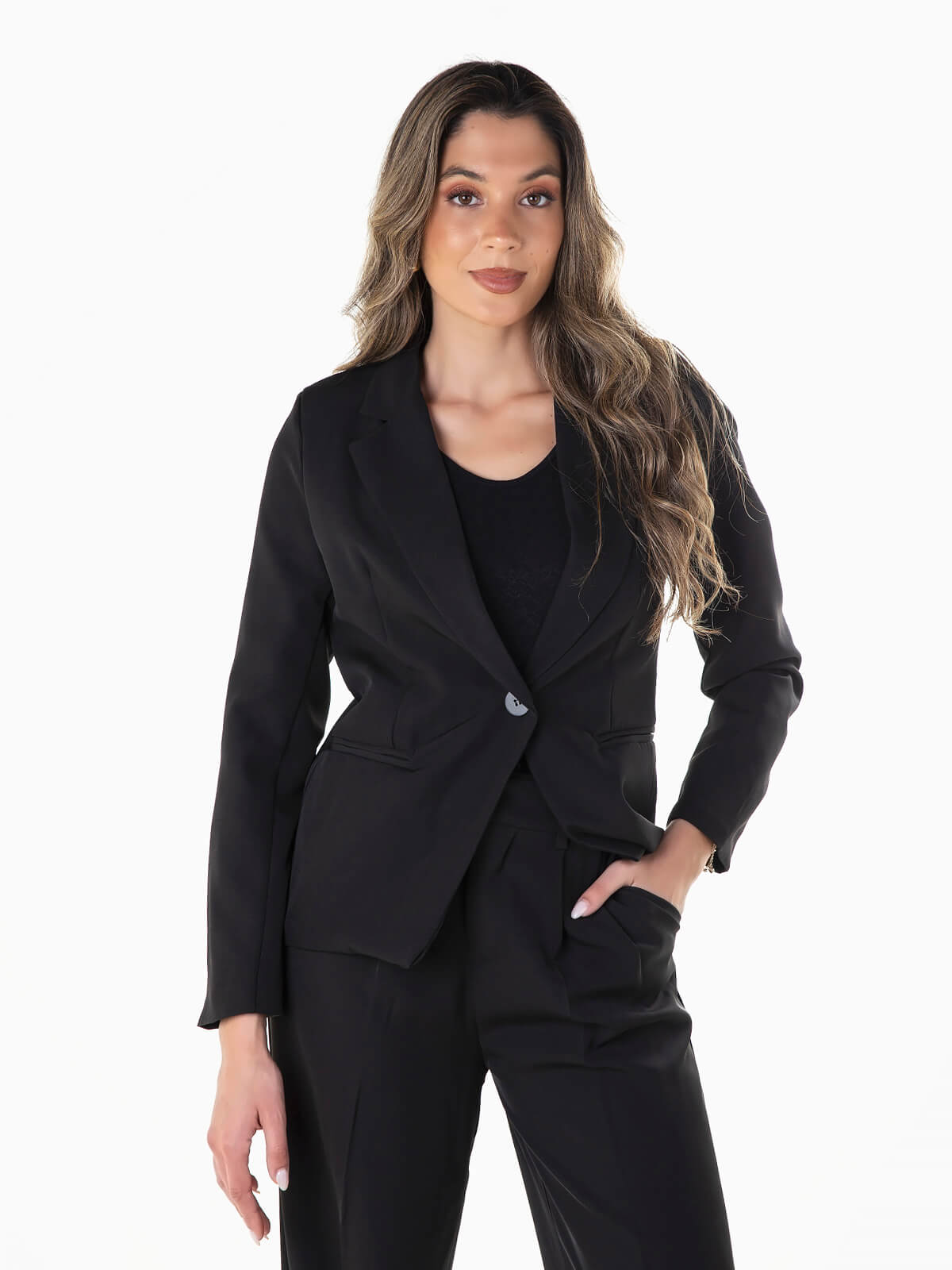 Blazer cintado com aperto de botão. Blazer manga comprida com ombreiras. Gola abas e lapelas. Interior forrado. Bolsos decorativos.