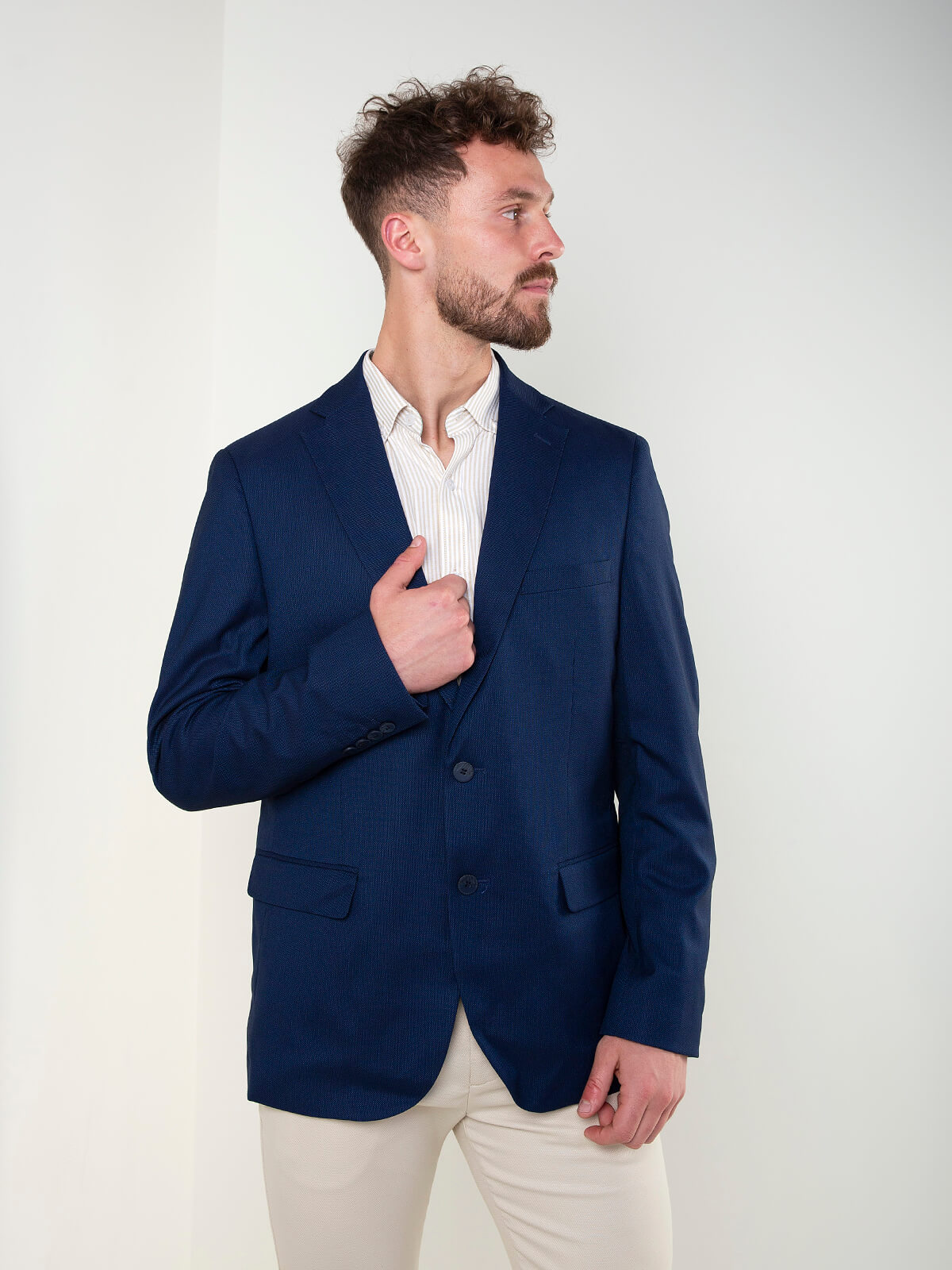 Blazer clássico de homem com micropadrão e corte de alfaiataria. Modelo com lapela, fecho frontal com botões e bolsos frontais. Uma peça versátil, ideal para looks formais ou combinações mais casuais com um toque cuidado.