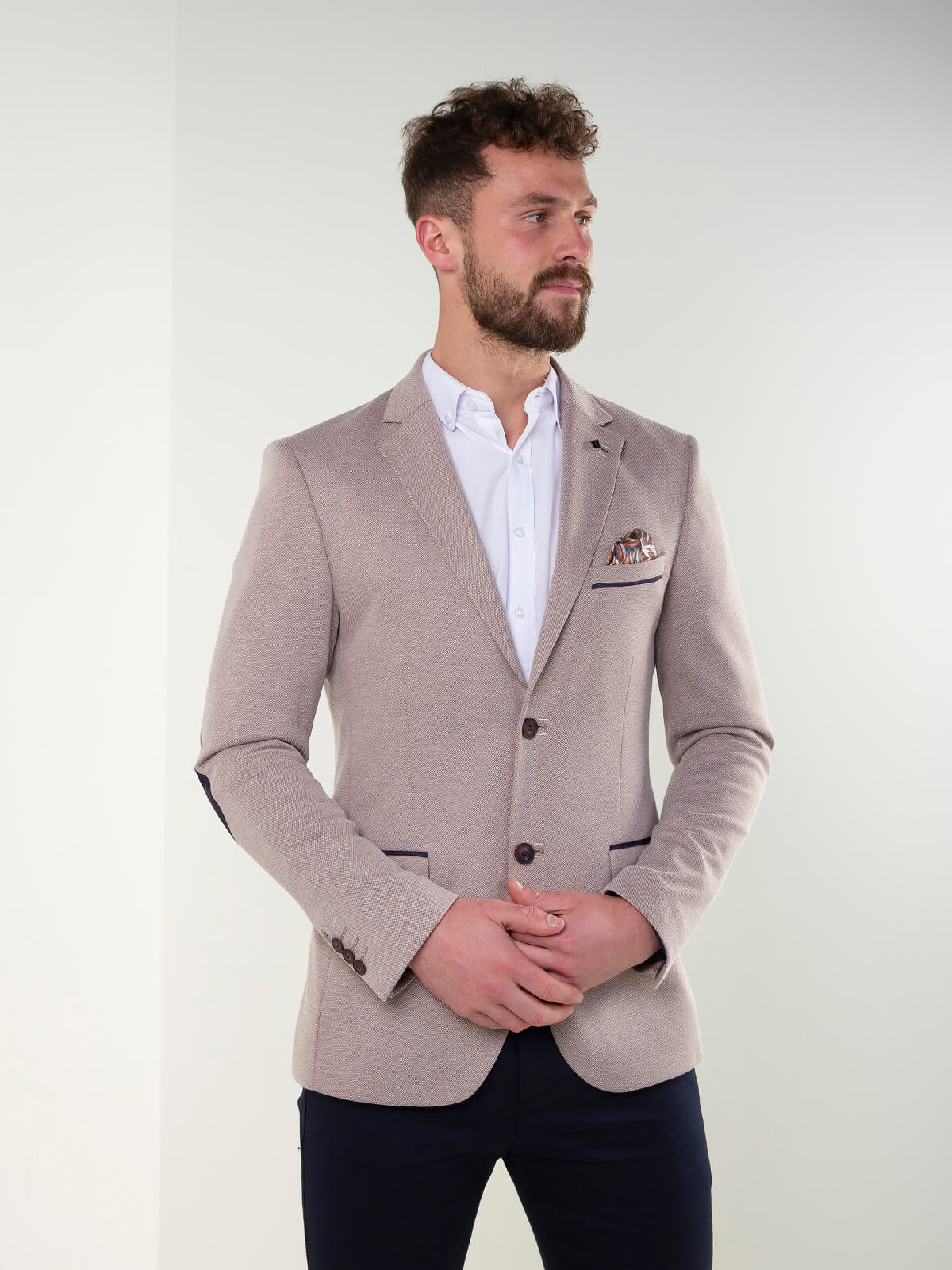 Blazer de homem em tecido mesclado com corte clássico e fecho frontal com dois botões. Modelo com bolsos frontais com aba, bolso no peito e detalhe de cotoveleiras em contraste. Interior parcialmente forrado com bolso interior, ideal para um look elegante e atual.