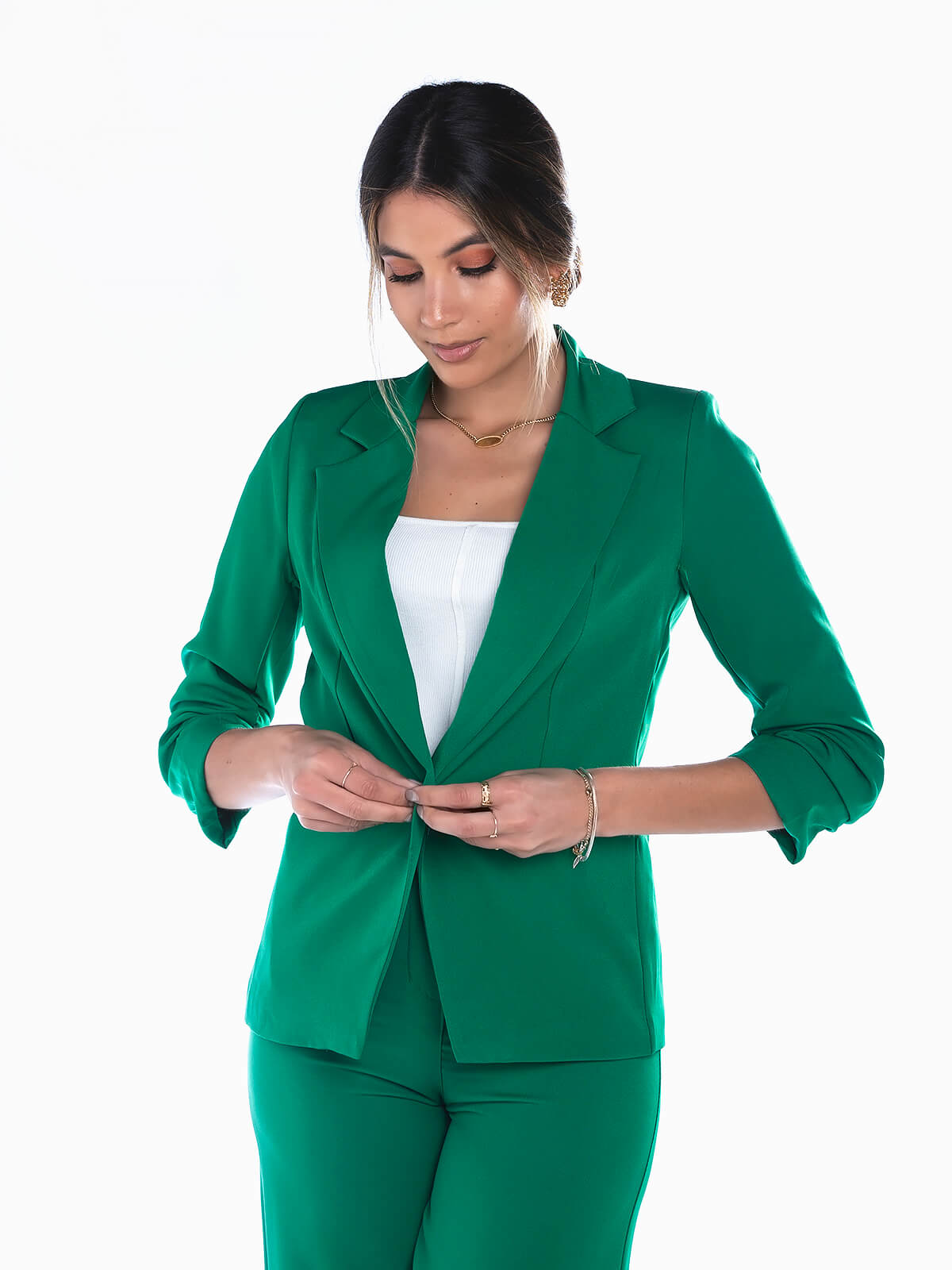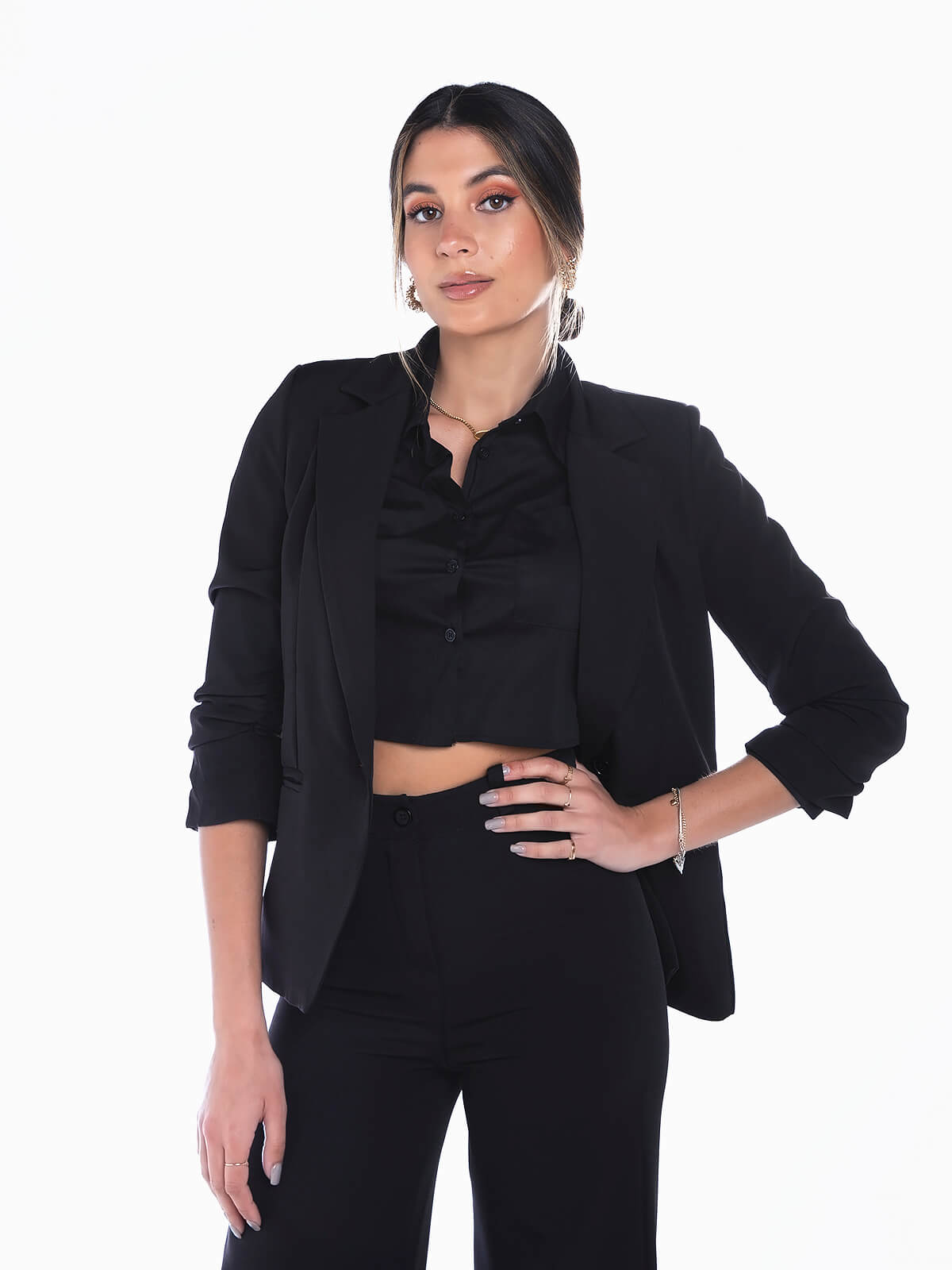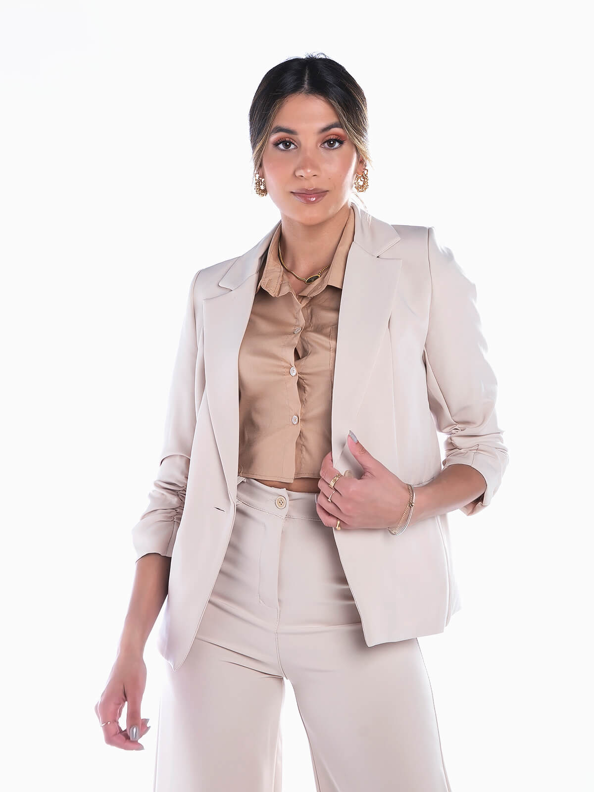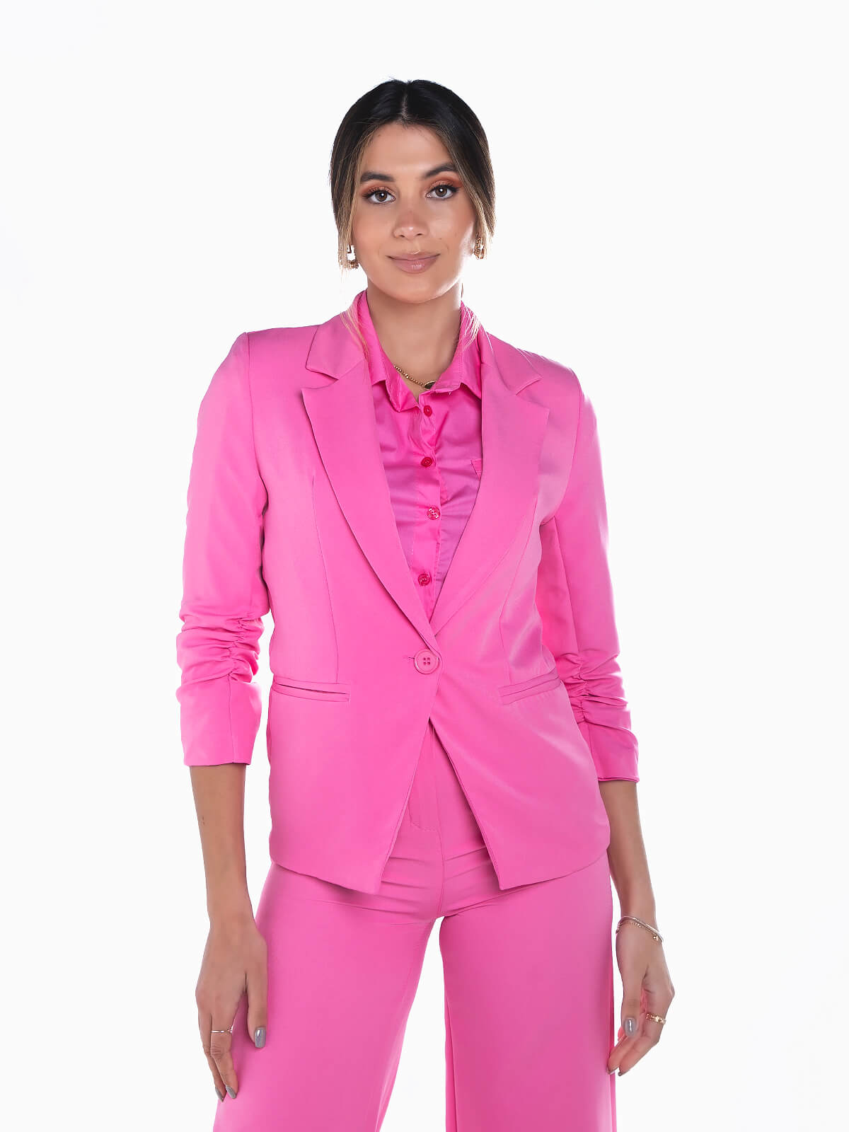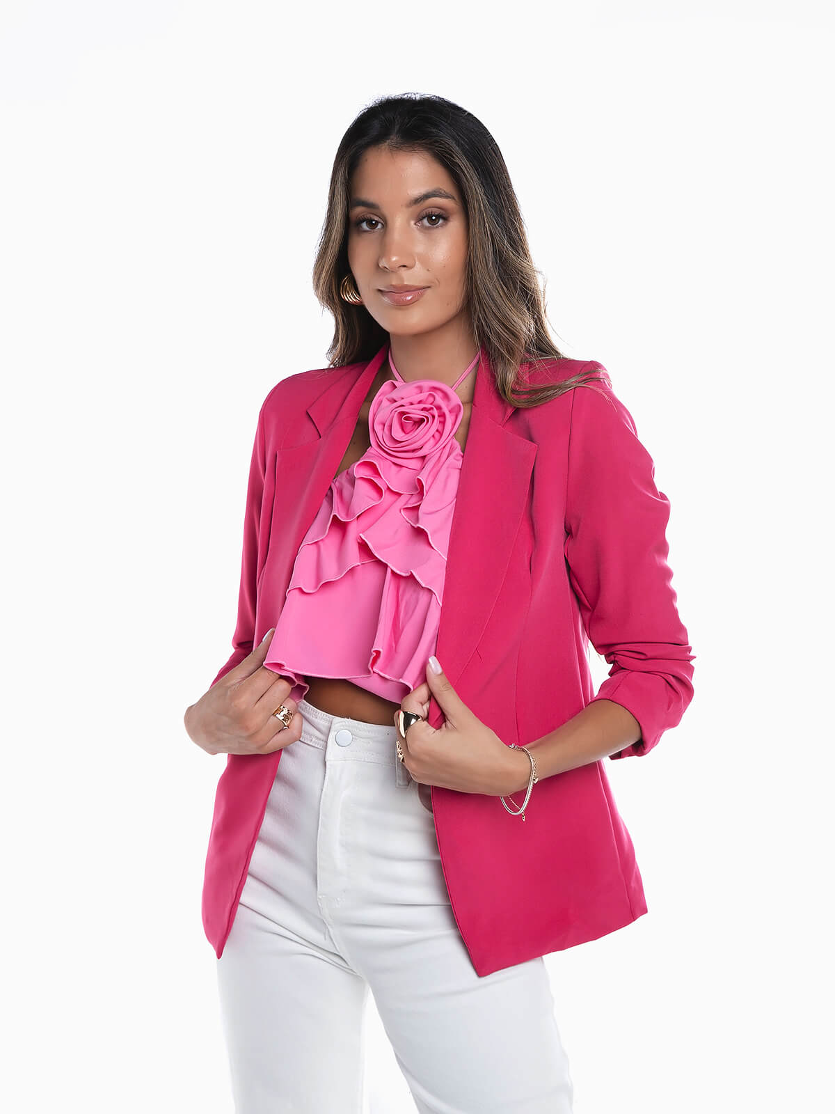 Blazer com manga franzida para senhora. Blazer com interior forrado e ombreiras. Dois bolsos decorativos na frente com abertura debruada. Gola de abas e lapelas. Aperto de um botão frontal.