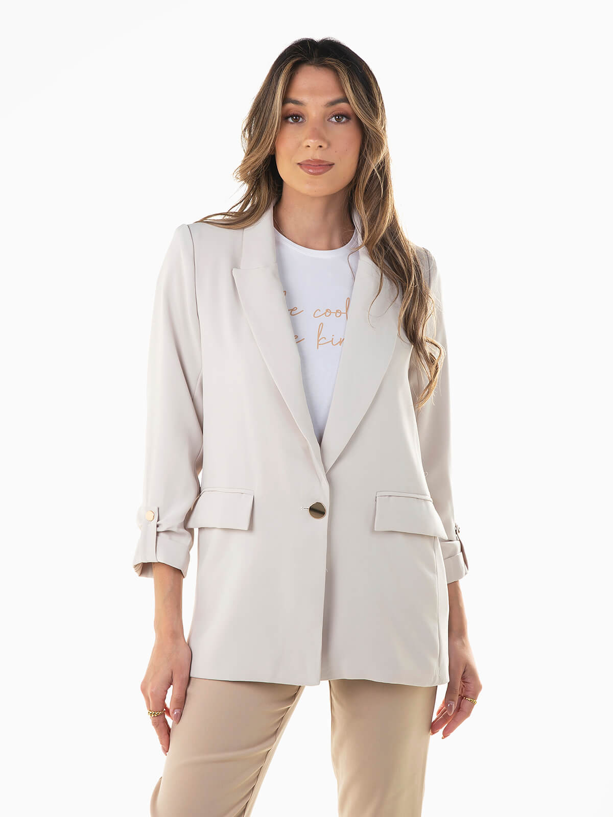 Blazer de manga 3/4 com presilhas para mulher. Blazer com interior forrado e palas decorativas. Gola abas. Aperto frontal de botão.