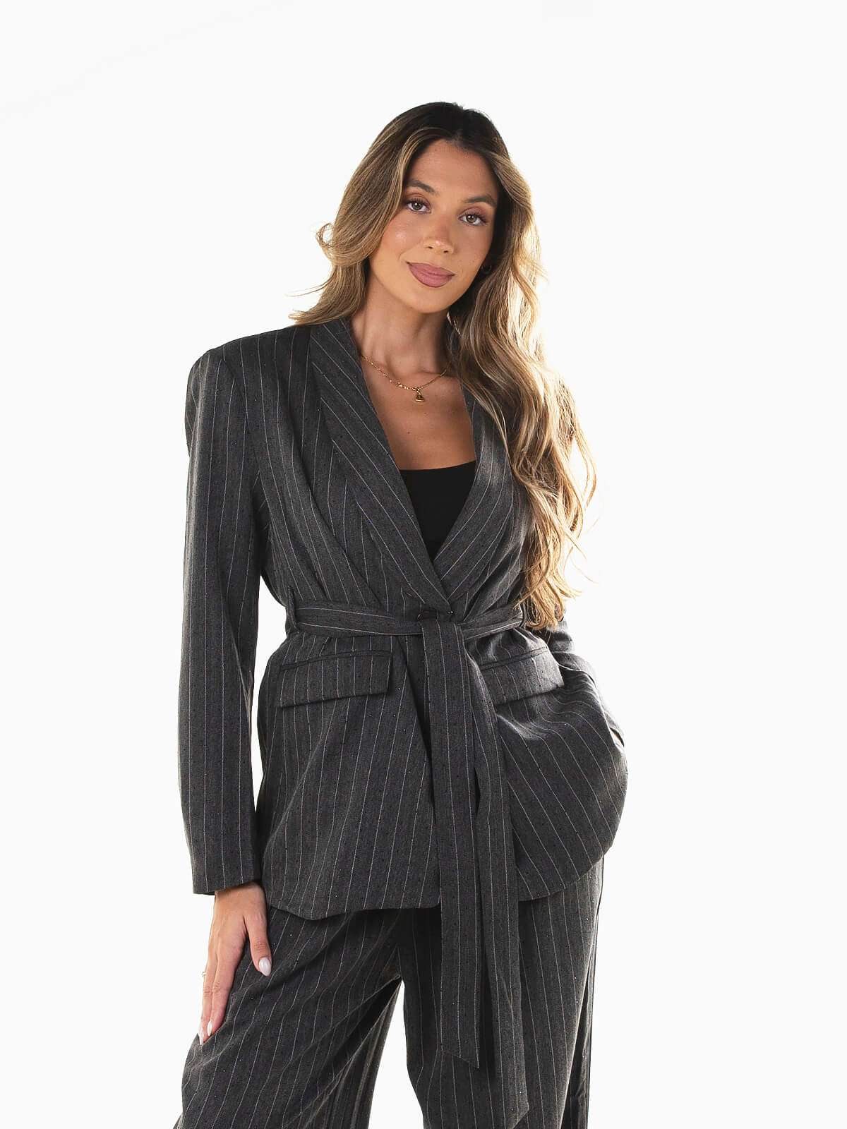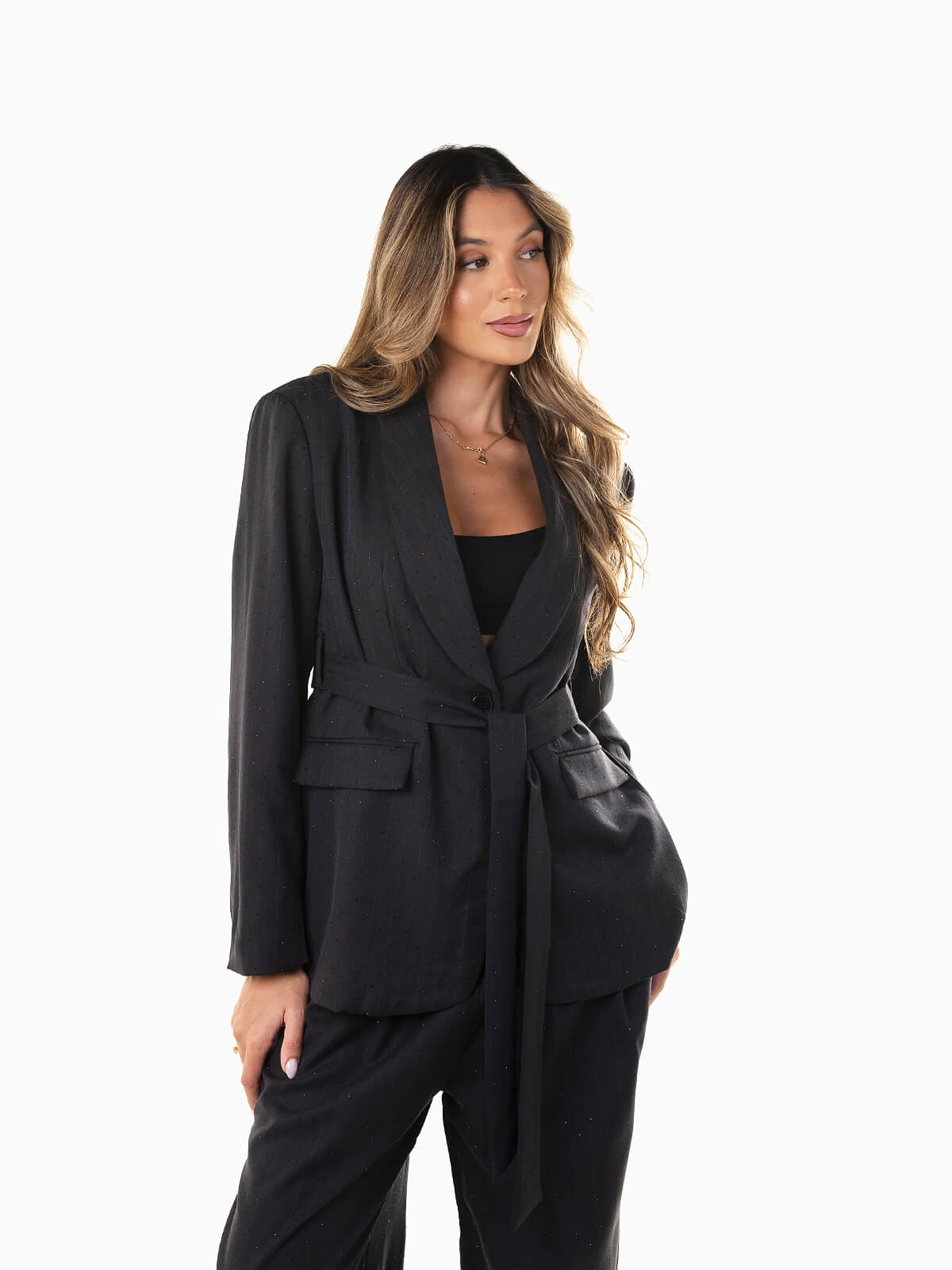 Blazer feminino em padrão de riscas diplomáticas, com corte ligeiramente comprido, strass e cinto ajustável que realça a silhueta. Modelo elegante com interior forrado, ombreiras, gola de abas e lapelas e aperto de botão. Ideal para conjugar com as calças a condizer ou para elevar um look casual com jeans.