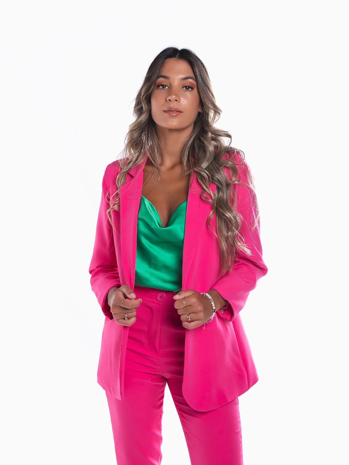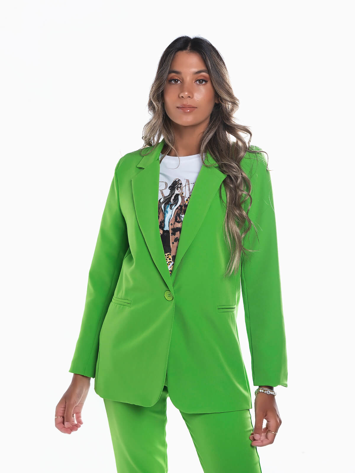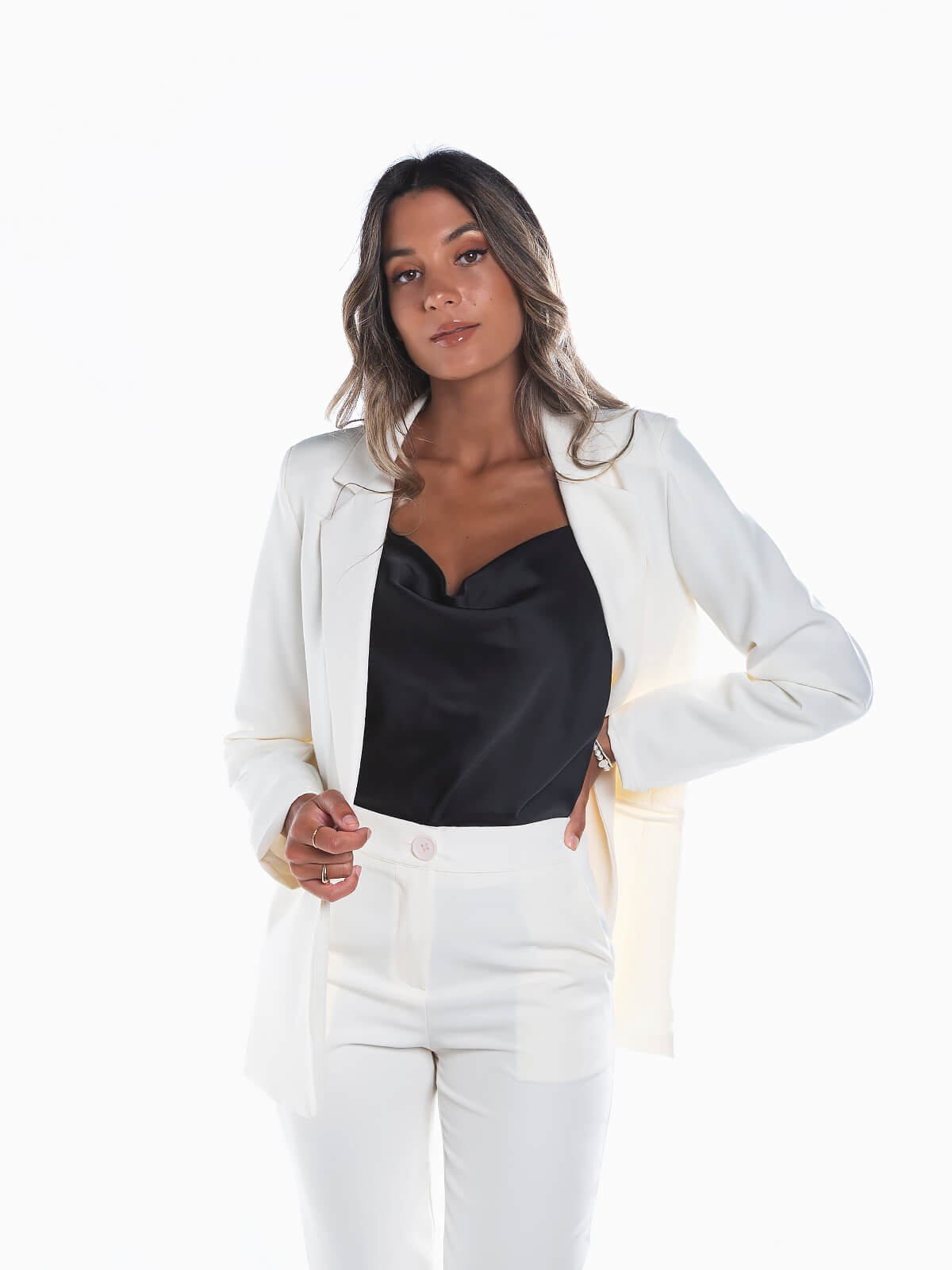 Blazer comprido básico para senhora. Blazer de gola de lapelas e manga comprida com ombreiras. Efeito de bolsos na frente com abertura debruada. Forrado. Aperto de um botão frontal.