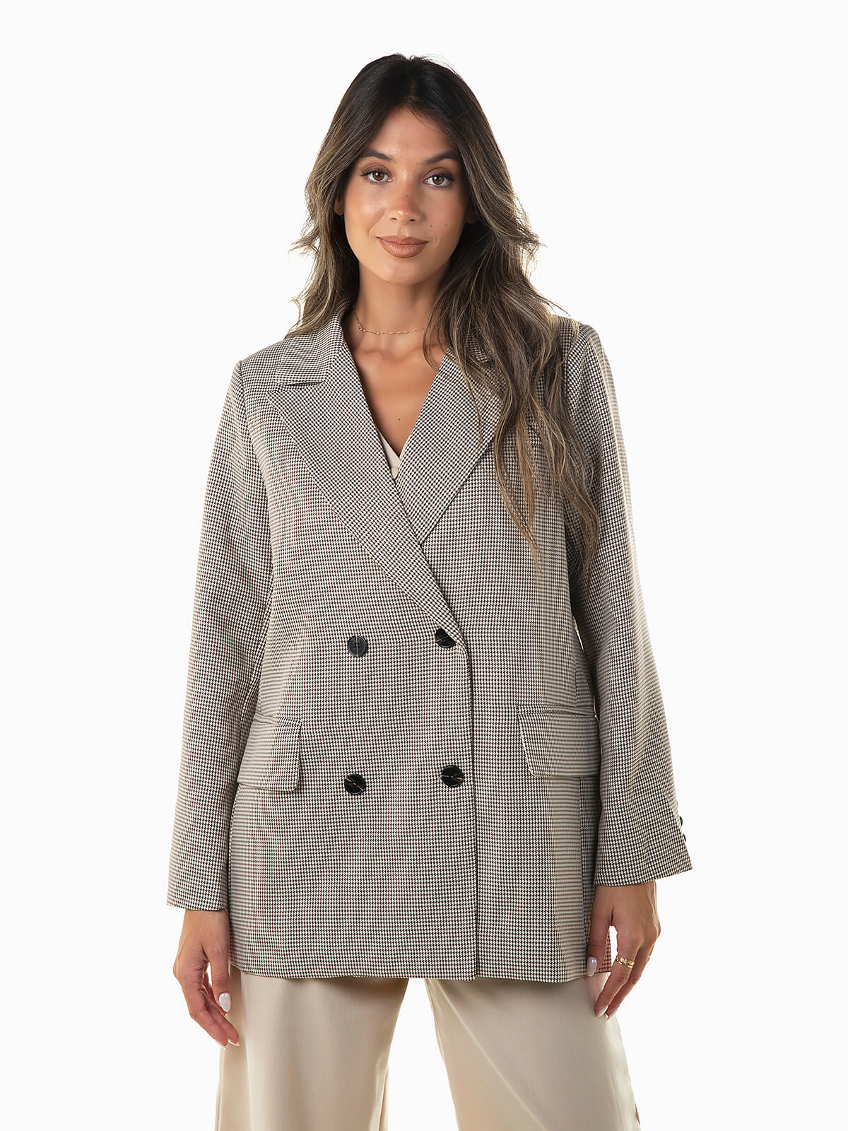 Blazer bege comprido pied-de-poule para senhora. Blazer oversize manga comprida com ombreiras e interior forrado. 2 bolsos com abas. Aperto cruzado de botões.