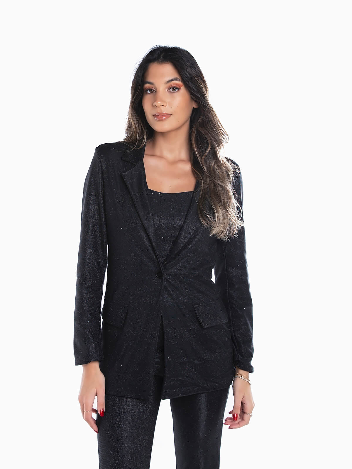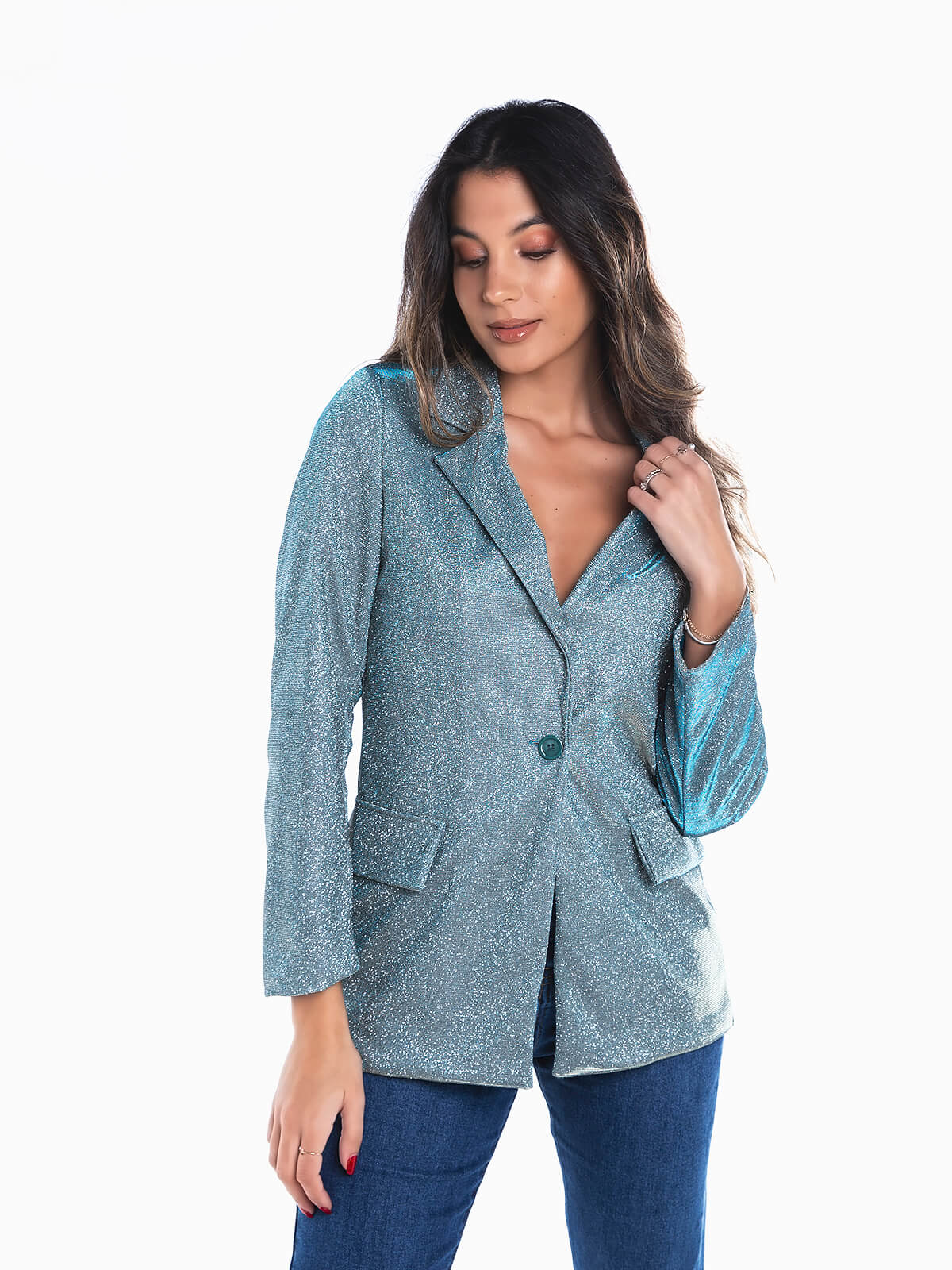 Blazer comprido em fios lurex para efeito brilhante. Blazer para senhora com interior forrado. Manga comprida. Gola de abas e lapelas. 2 palas decorativas. Aperto de um botão.