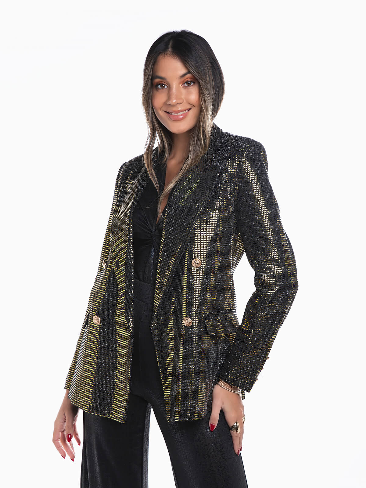 Blazer de lantejoulas com efeito brilhante e interior forrado. Blazer manga comprida acabada com botões decorativos. Gola de abas e lapelas. 2 bolsos. Aperto cruzado de botões.