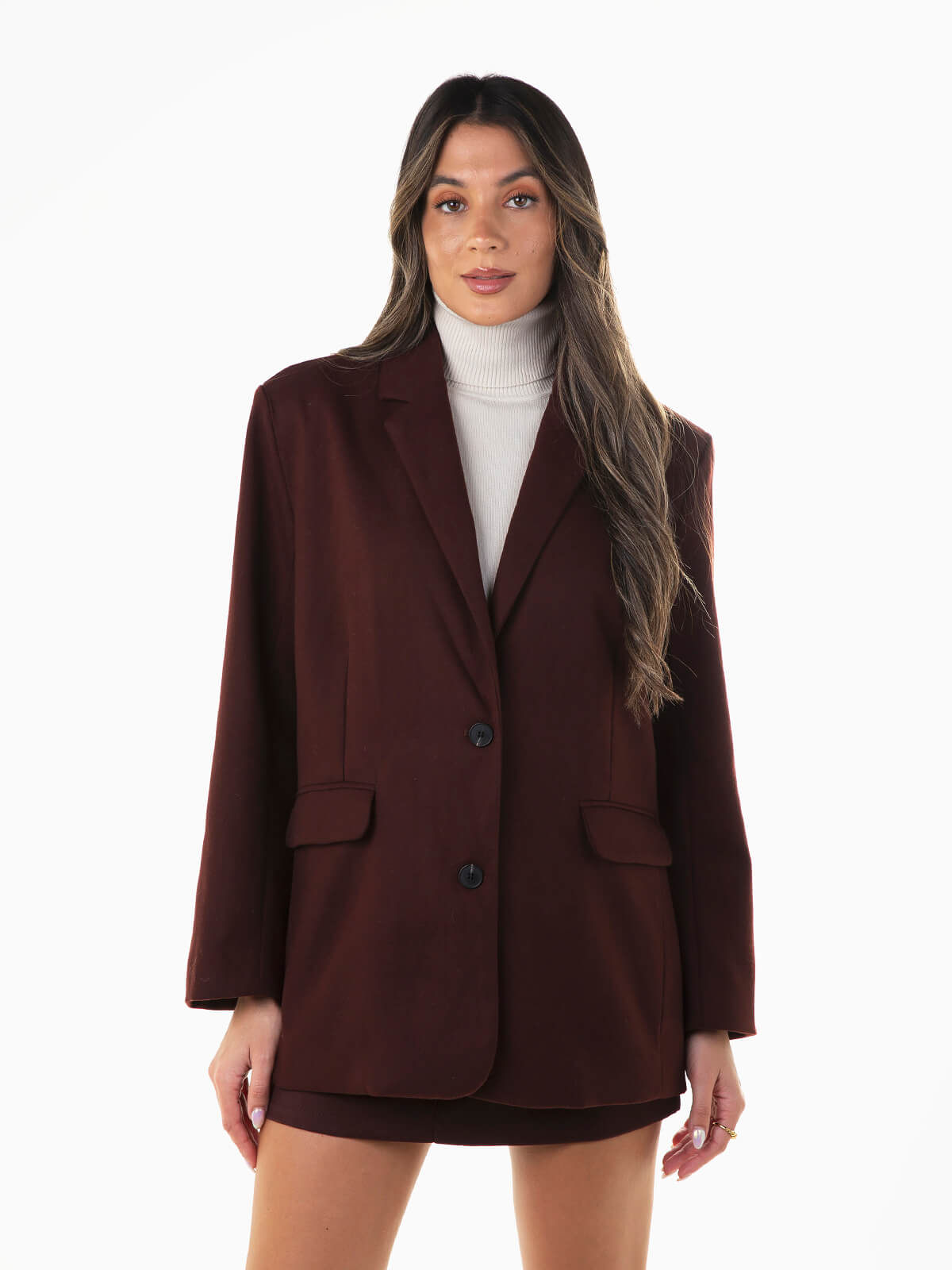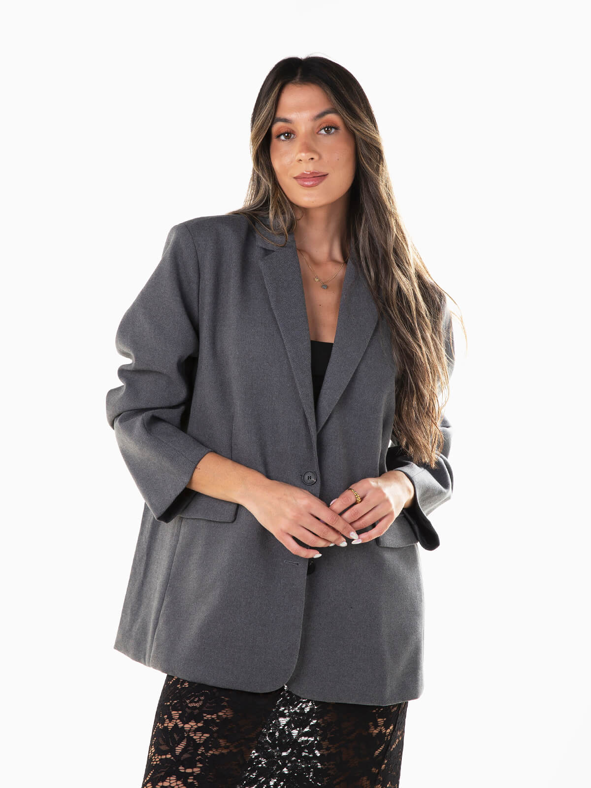 Blazer oversize fazenda com interior forrado. Blazer de manga comprida com punhos abotoados. Gola abas e lapelas. 2 bolsos.