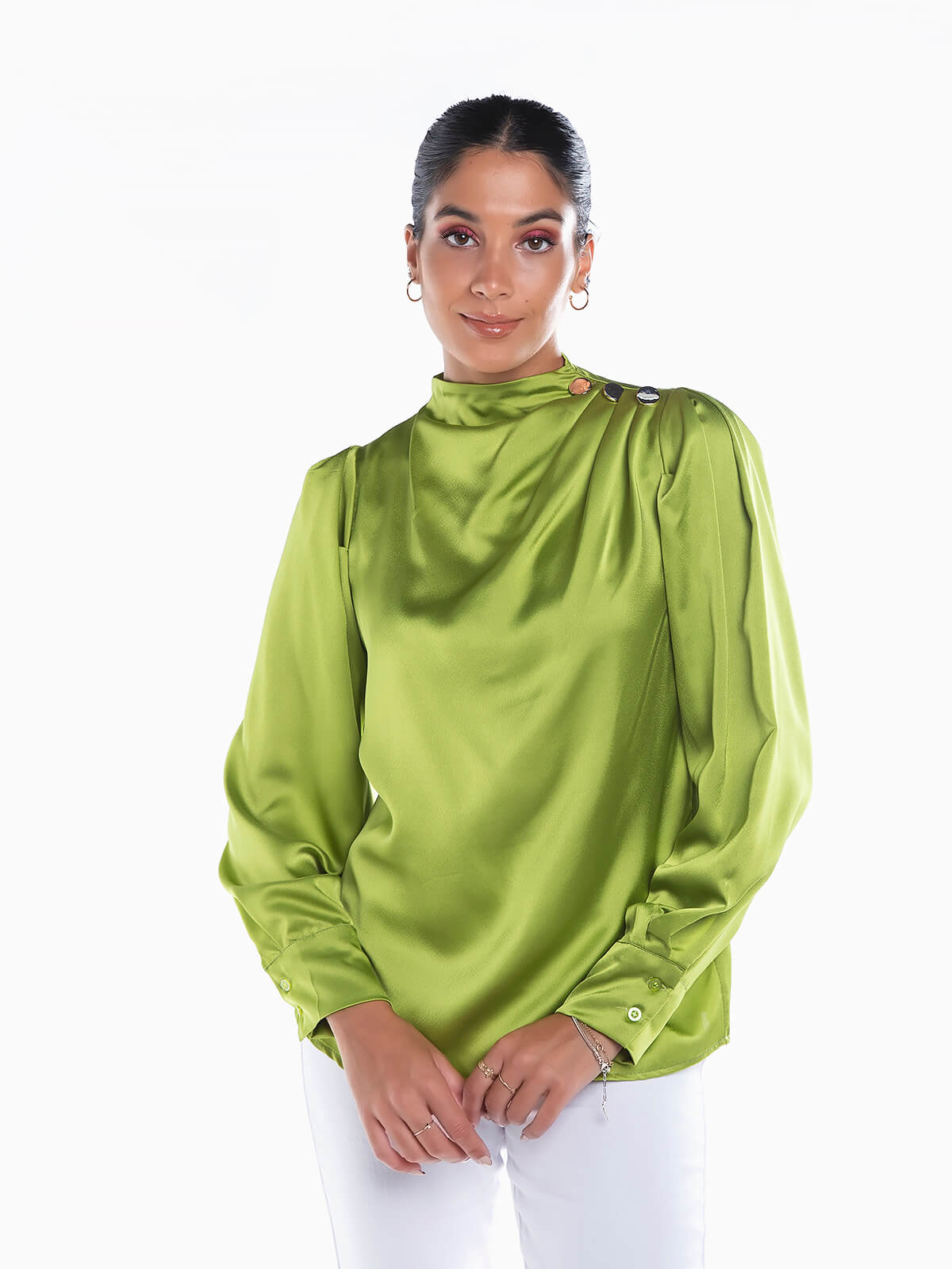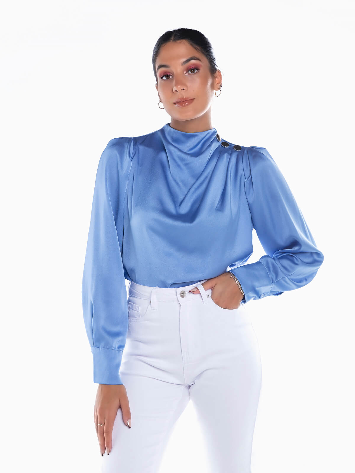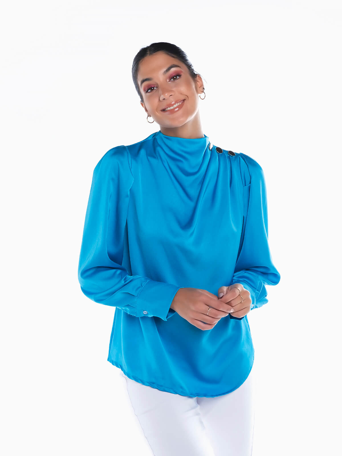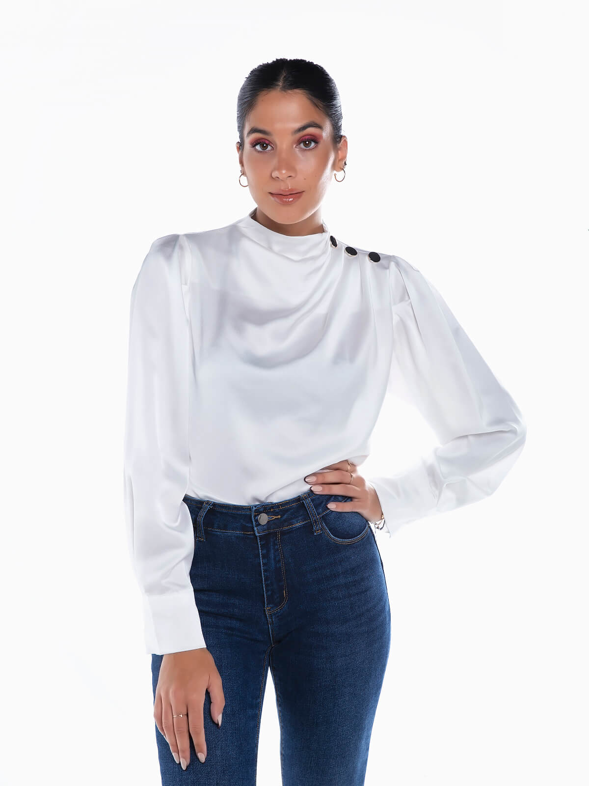 Blusa acetinada com botões decorativos no ombro. Blusa com gola subida e manga comprida abalonada. Punhos abotoados. Aperto posterior de fecho éclair.