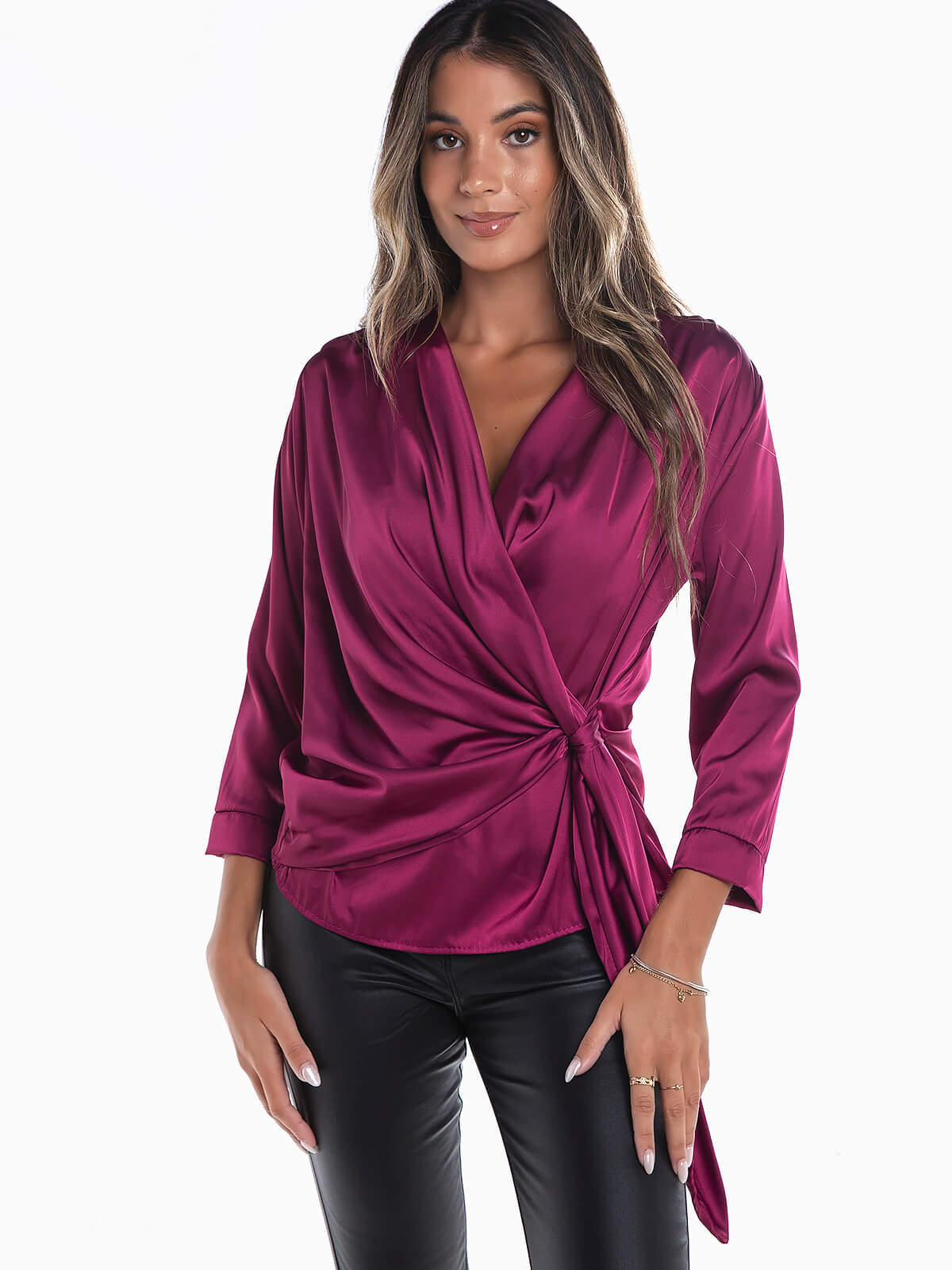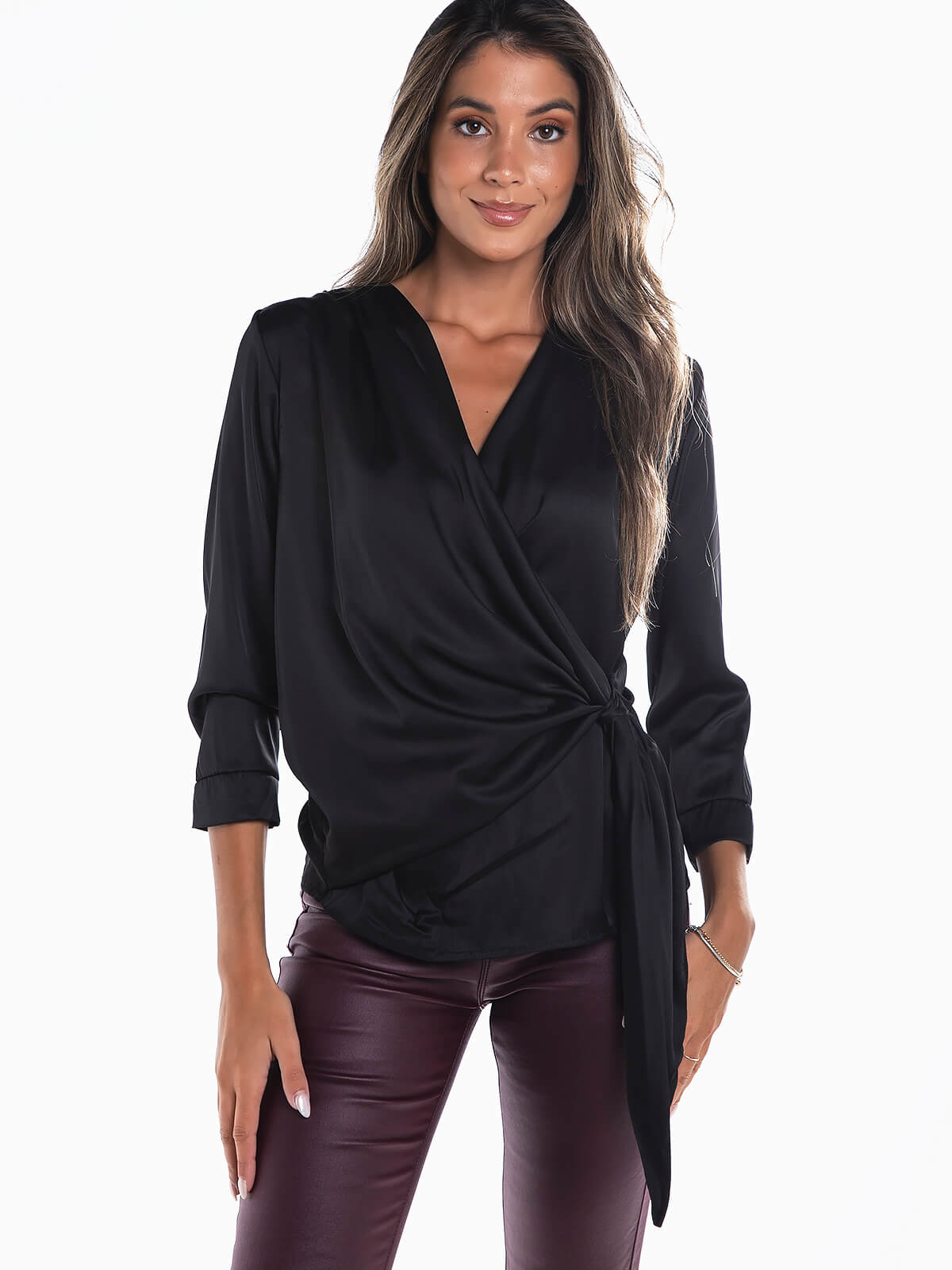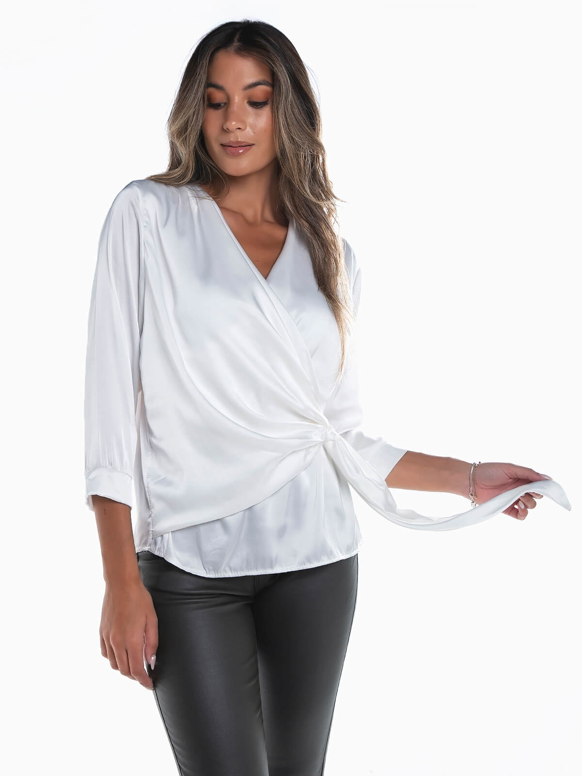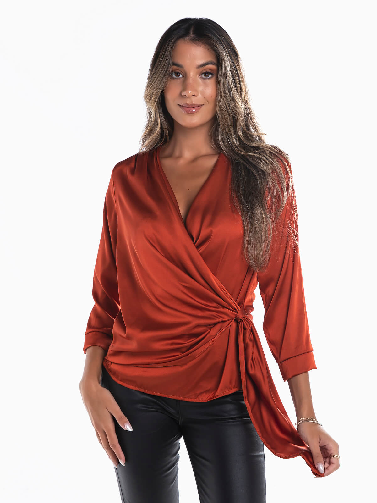 Blusa acetinada com decote cruzado e pormenor de nó na lateral. Blusa para senhora com manga 3/4.