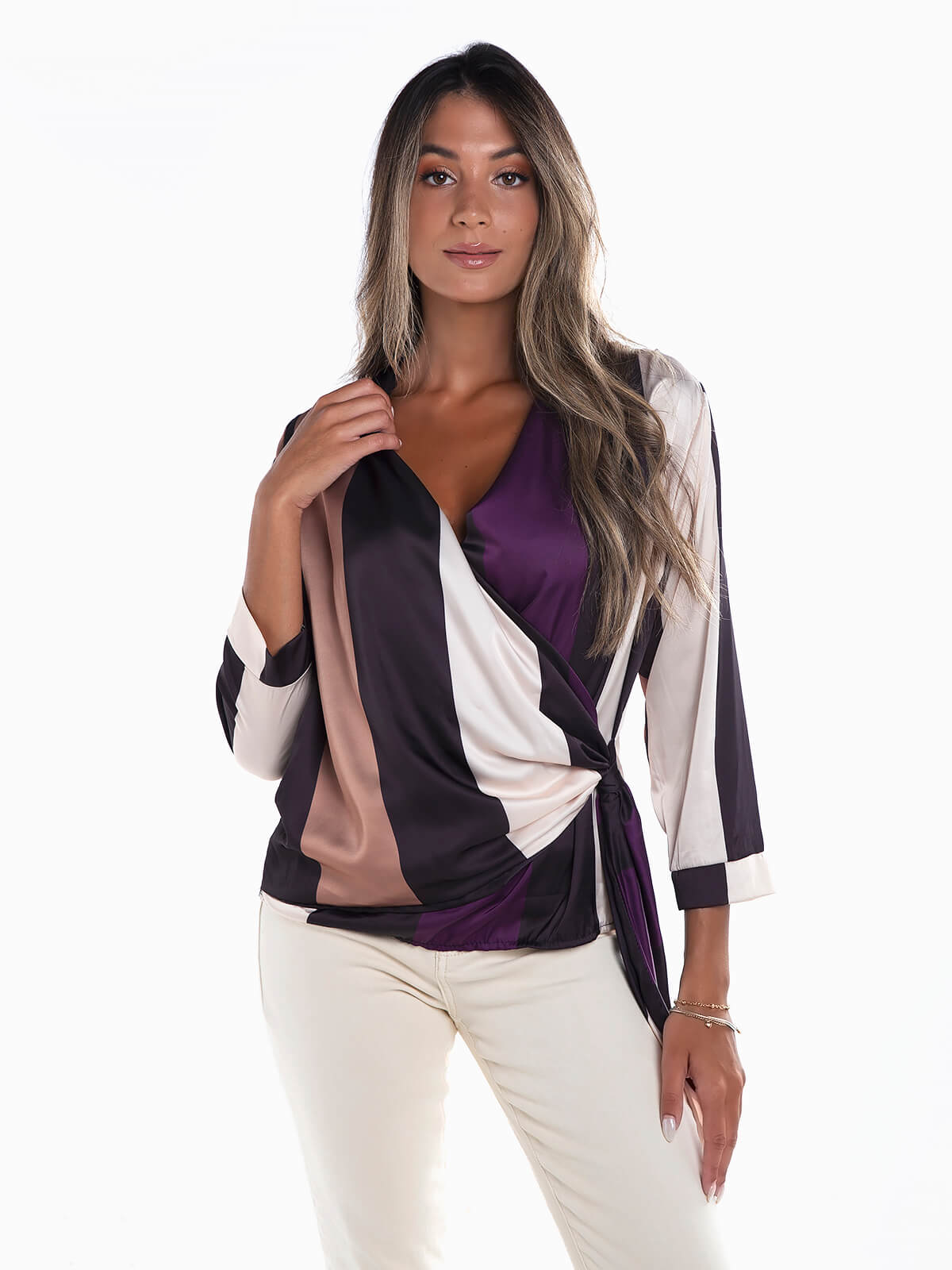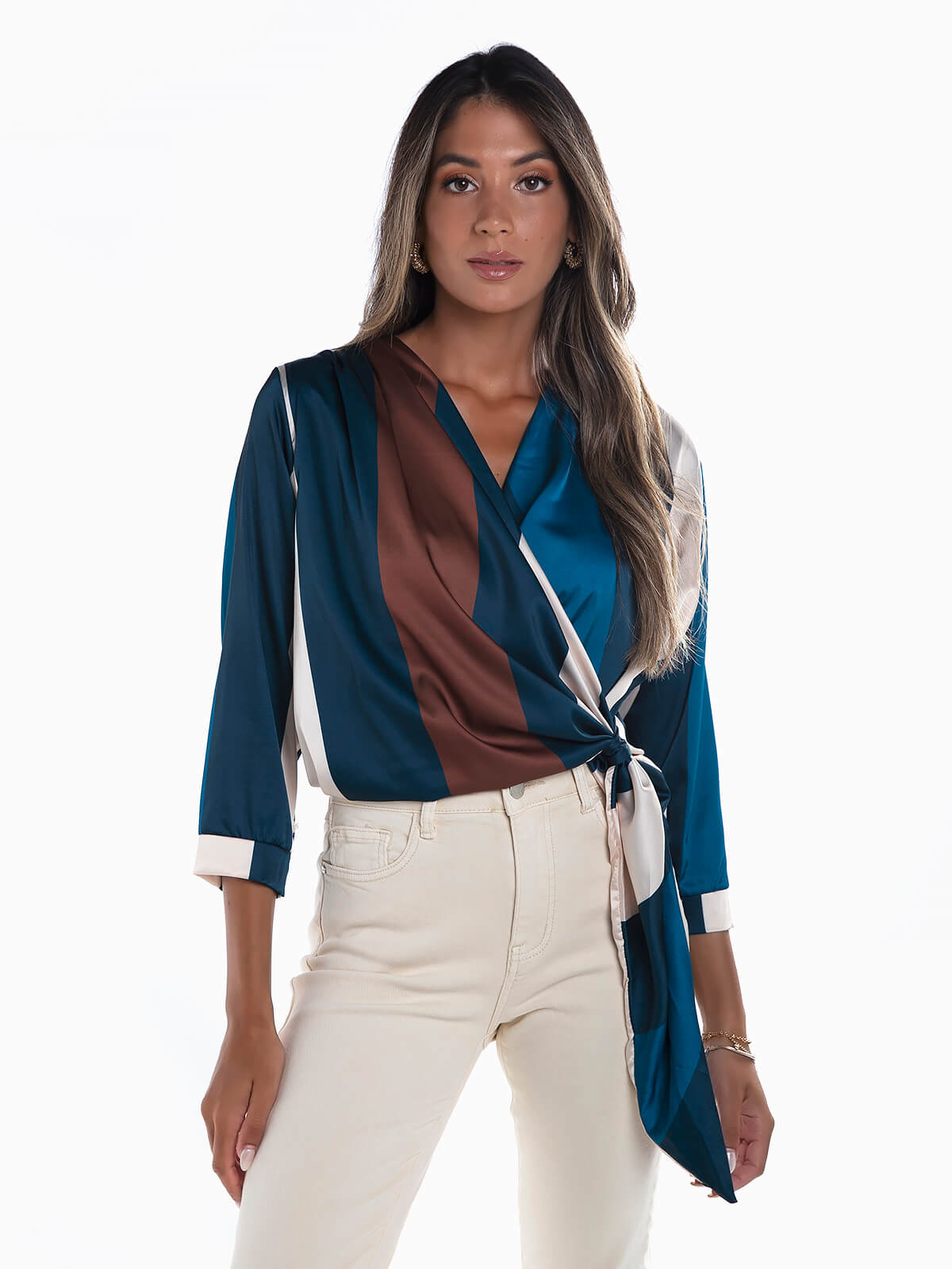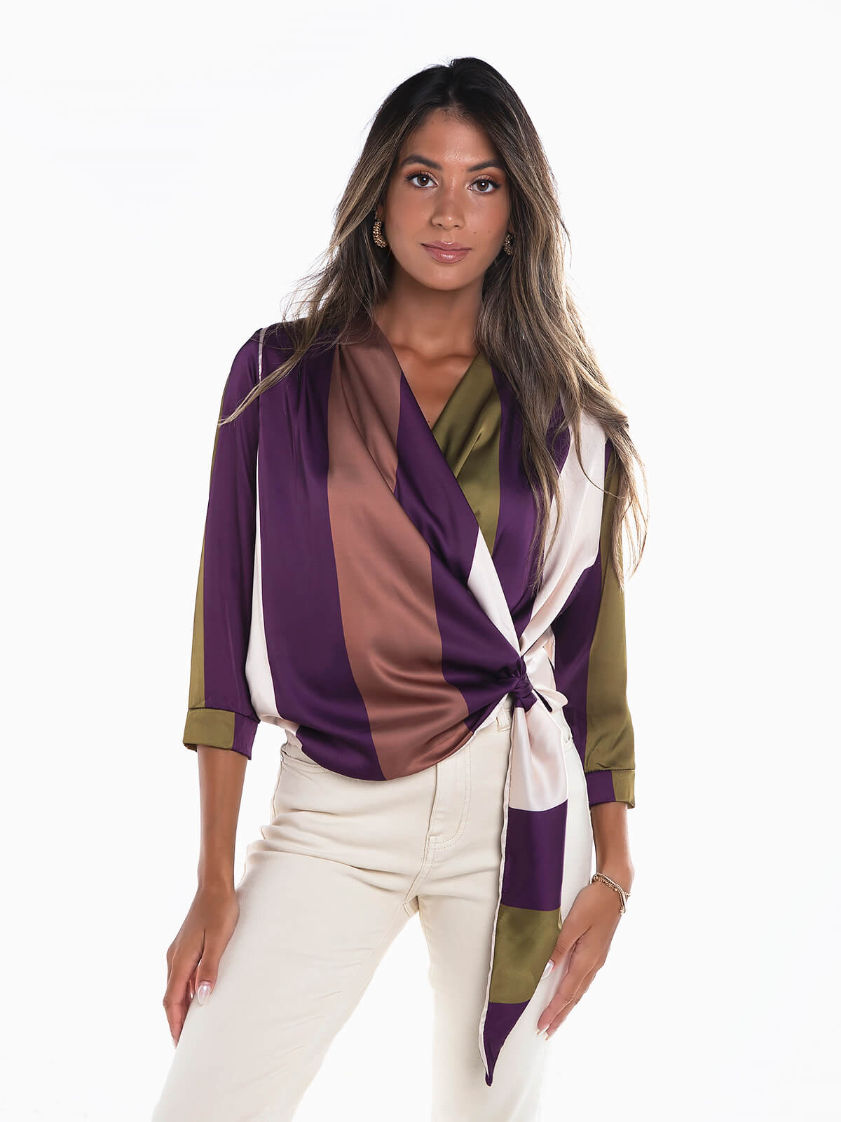 Blusa acetinada com encaixe de cores e decote cruzado. Blusa para senhora com manga 3/4 e pormenor de nó na lateral.