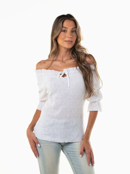 Blusa de manga curta azul marinho com padrão de cornucópias. Blusa fluída com decote redondo e aperto posterior de botão. Combina com calças de alfaiataria ou jeans de cintura alta e sapatos rasos. Um look confortável e elegante para o dia a dia.