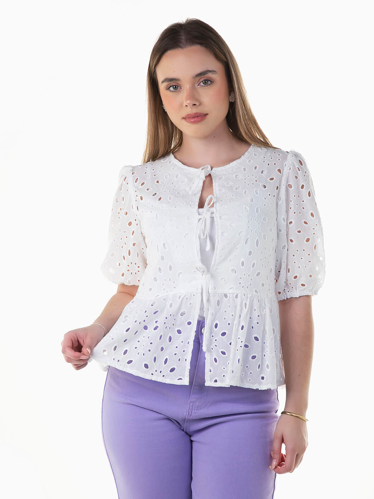 Blusa branca em bordado inglês com aperto frontal de laços. Blusa de manga curta abalonada com folho na base. Pormenor elástico nos punhos e cintura. Decote redondo.