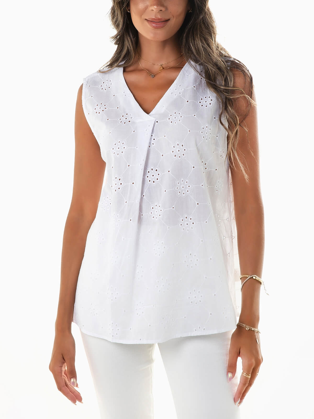 Blusa branca sem mangas confeccionada em tecido 100% algodão para maior conforto e respirabilidade. Blusa com bordado suiço e decote em V.