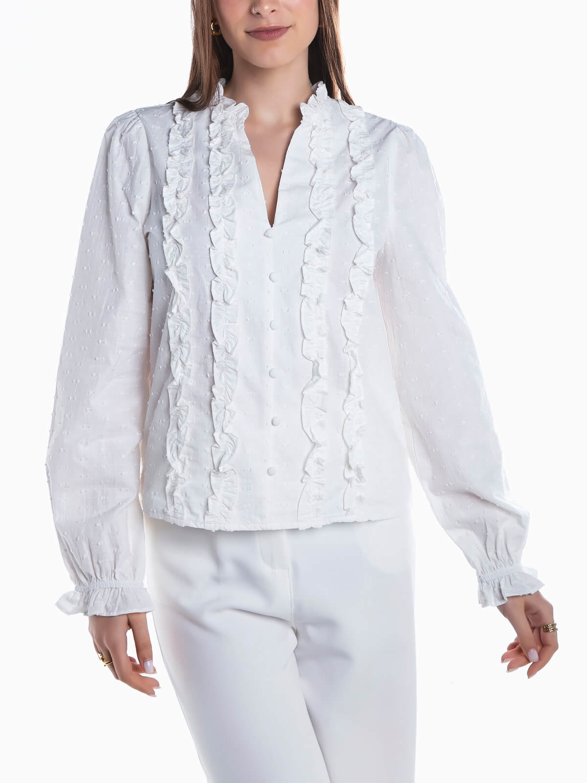 Blusa branca com tecido ponto suiço em relevo. Blusa de manga comprida com folhos aplicados. Punhos elásticos. Decote em bico e botões decorativos.