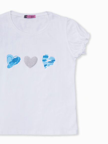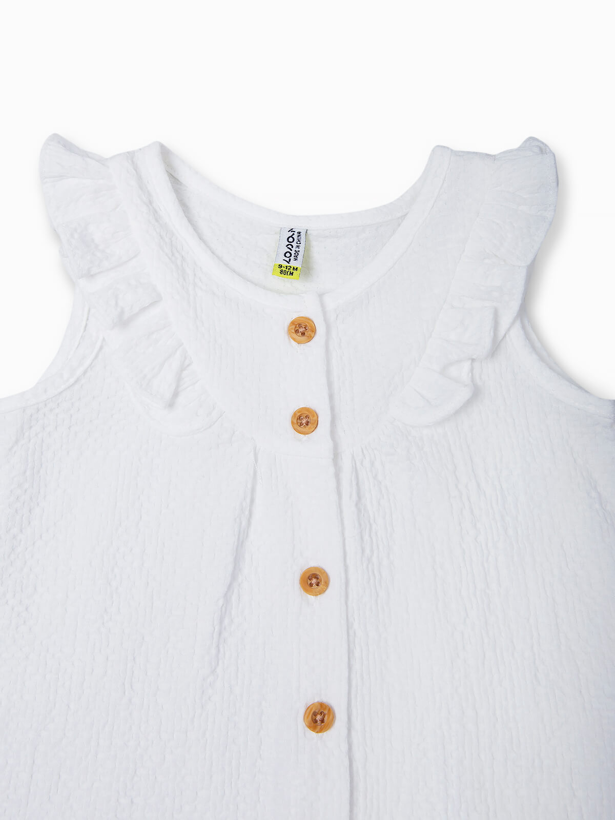 Blusa branca em tecido com textura para bebé menina. Blusa sem mangas com decote redondo e pormenor de folhos. Aperto frontal de botões em contraste.
