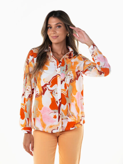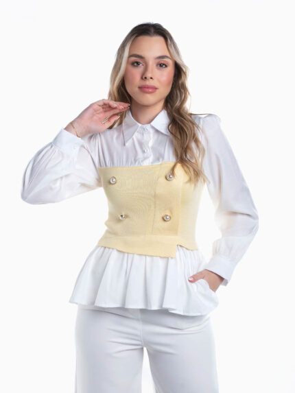 Blusa branca sem mangas com estampado de corações pretos em contraste. Blusa em duplo tecido com encaixe de folhos na gola e cava. Decote redondo com abertura e cordão para laço. Cós arredondado mais comprido atrás.