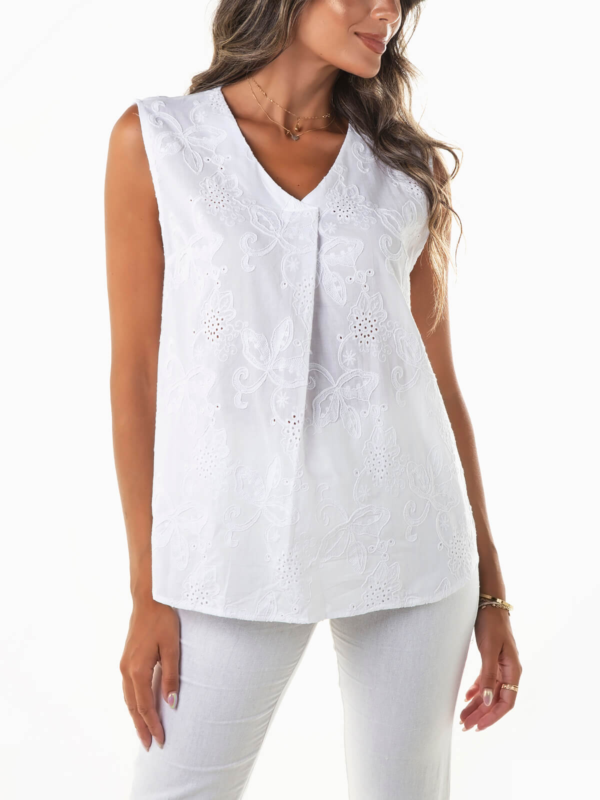Blusa branca sem mangas combinada com bordado suiço e flores no mesmo tom. Blusa confeccionada em tecido 100% algodão para maior conforto e respirabilidade. Decote em V.