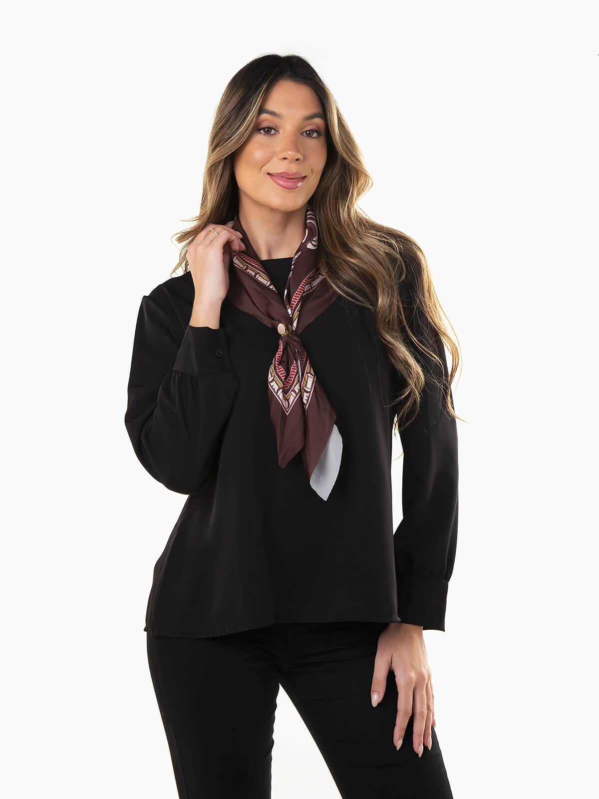 Blusa fluída para mulher com lenço decorativo incluído amovível. Modelo elegante de manga comprida com punhos abotoados, ideal para looks sofisticados de trabalho ou ocasiões especiais.