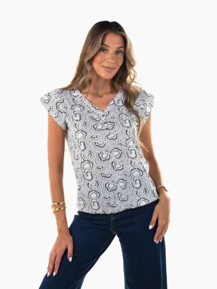 Blusa para mulher com estampado de limões em tons vibrantes, ideal para dar cor aos looks de verão. Modelo com decote em V, mangas abalonadas e corte ajustado com efeito elástico na zona da cintura para realçar a silhueta. Uma peça leve e fresca, perfeita para um visual feminino e descontraído nos dias mais quentes.