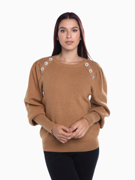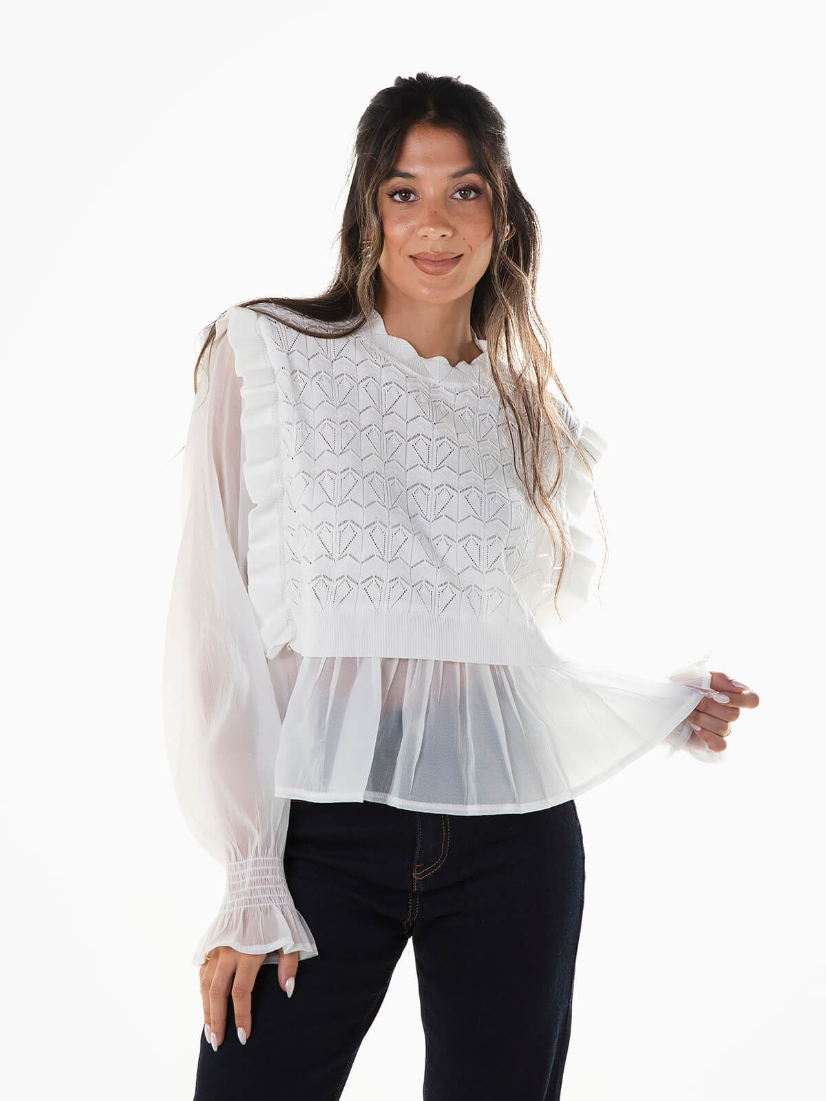 Blusa semitransparente combinada com malha perfurada. Blusa manga comprida com punhos elásticos e decote redondo recortado.