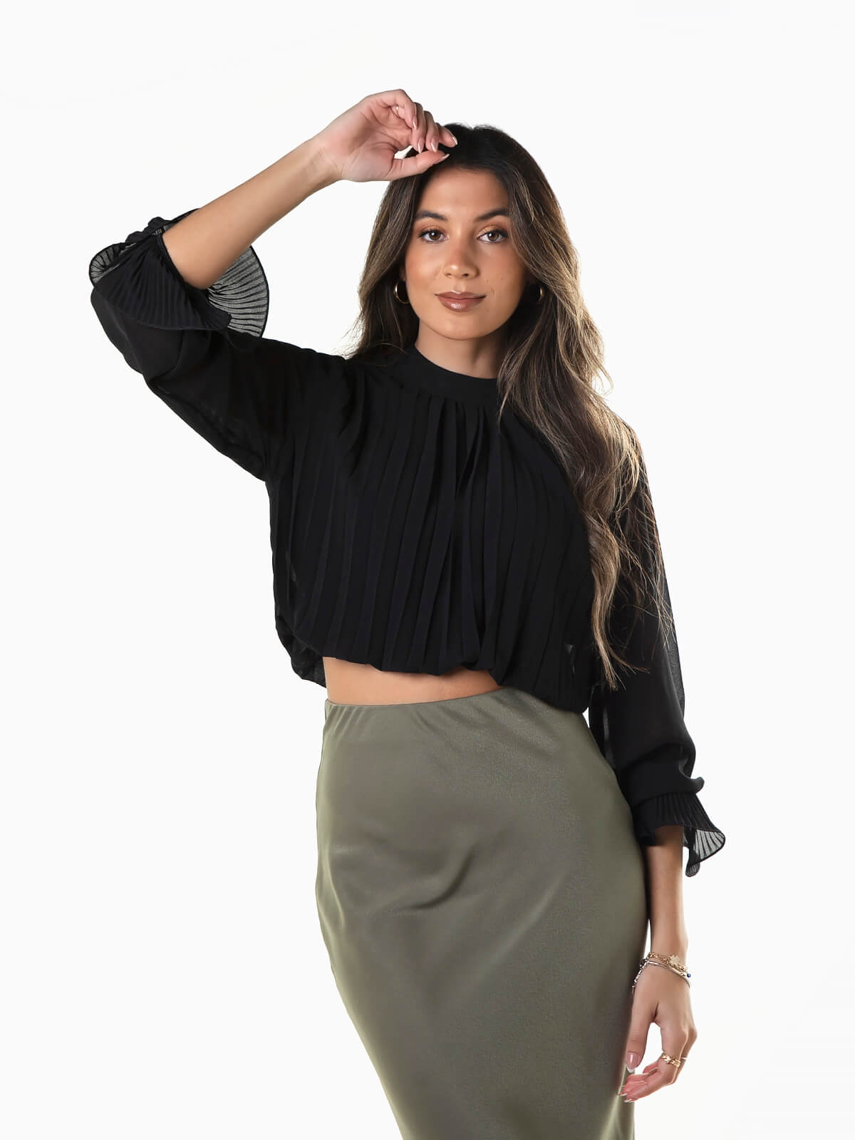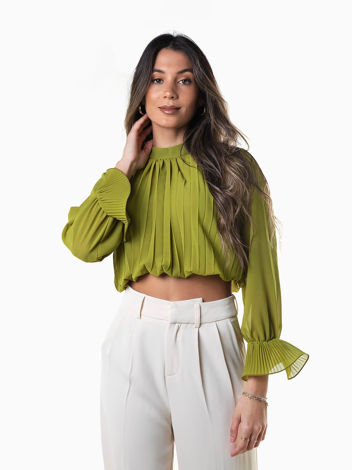 Blusa cropped plissada para senhora. Blusa de manga comprida acabada com folho. Elástico na base e interior forrado. Decote redondo e aperto posterior de botão.